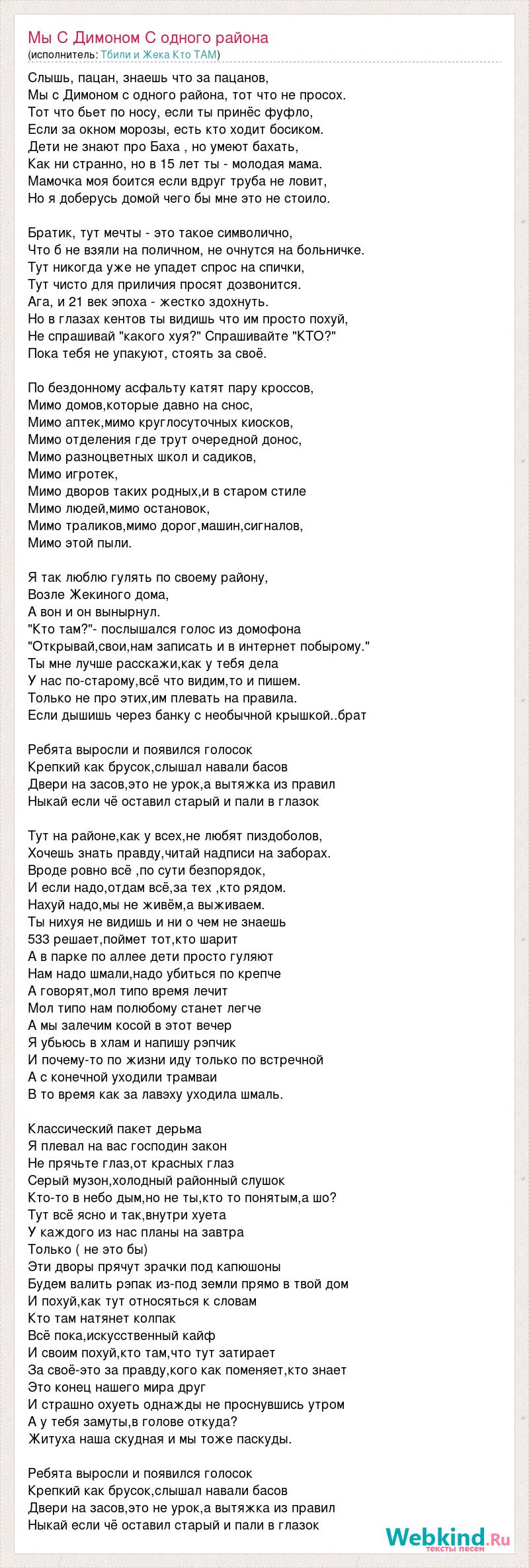 Слышь, пацан, знаешь что за пацанов, Мы с Димоном с одного района, тот что не просох. Тот что бьет по носу, если ты принёс фуфло, Если за окном морозы, есть кто ходит босиком. Дети не знают про Баха , но умеют бахать, Как ни странно, но в 15 лет ты - молодая мама. Мамочка моя боится если вдруг труба не ловит, Но я доберусь домой чего бы мне это не стоило. Братик, тут мечты - это такое символично, Что б не взяли на поличном, не очнутся на больничке. Тут никогда уже не упадет спрос на спички, Тут чисто для приличия просят дозвонится. Ага, и 21 век эпоха - жестко здохнуть. Но в глазах кентов ты видишь что им просто похуй, Не спрашивай "какого хуя?" Спрашивайте "КТО?" Пока тебя не упакуют, стоять за своё. По бездонному асфальту катят пару кроссов, Мимо домов,которые давно на снос, Мимо аптек,мимо круглосуточных киосков, Мимо отделения где трут очередной донос, Мимо разноцветных школ и садиков, Мимо игротек, Мимо дворов таких родных,и в старом стиле Мимо людей,мимо остановок, Мимо траликов,мимо дорог,машин,сигналов, Мимо этой пыли. Я так люблю гулять по своему району, Возле Жекиного дома, А вон и он вынырнул. "Кто там?"- послышался голос из домофона "Открывай,свои,нам записать и в интернет побырому." Ты мне лучше расскажи,как у тебя дела У нас по-старому,всё что видим,то и пишем. Только не про этих,им плевать на правила. Если дышишь через банку с необычной крышкой..брат Ребята выросли и появился голосок Крепкий как брусок,слышал навали басов Двери на засов,это не урок,а вытяжка из правил Ныкай если чё оставил старый и пали в глазок Тут на районе,как у всех,не любят пиздоболов, Хочешь знать правду,читай надписи на заборах. Вроде ровно всё ,по сути безпорядок, И если надо,отдам всё,за тех ,кто рядом. Нахуй надо,мы не живём,а выживаем. Ты нихуя не видишь и ни о чем не знаешь 533 решает,поймет тот,кто шарит А в парке по аллее дети просто гуляют Нам надо шмали,надо убиться по крепче А говорят,мол типо время лечит Мол типо нам полюбому станет легче А мы залечим косой в этот вечер Я убьюсь в хлам и напишу рэпчик И почему-то по жизни иду только по встречной А с конечной уходили трамваи В то время как за лавэху уходила шмаль. Классический пакет дерьма Я плевал на вас господин закон Не прячьте глаз,от красных глаз Серый музон,холодный районный слушок Кто-то в небо дым,но не ты,кто то понятым,а шо? Тут всё ясно и так,внутри хуета У каждого из нас планы на завтра Только ( не это бы) Эти дворы прячут зрачки под капюшоны Будем валить рэпак из-под земли прямо в твой дом И похуй,как тут относяться к словам Кто там натянет колпак Всё пока,искусственный кайф И своим похуй,кто там,что тут затирает За своё-это за правду,кого как поменяет,кто знает Это конец нашего мира друг И страшно охуеть однажды не проснувшись утром А у тебя замуты,в голове откуда? Житуха наша скудная и мы тоже паскуды. Ребята выросли и появился голосок Крепкий как брусок,слышал навали басов Двери на засов,это не урок,а вытяжка из правил Ныкай если чё оставил старый и пали в глазок