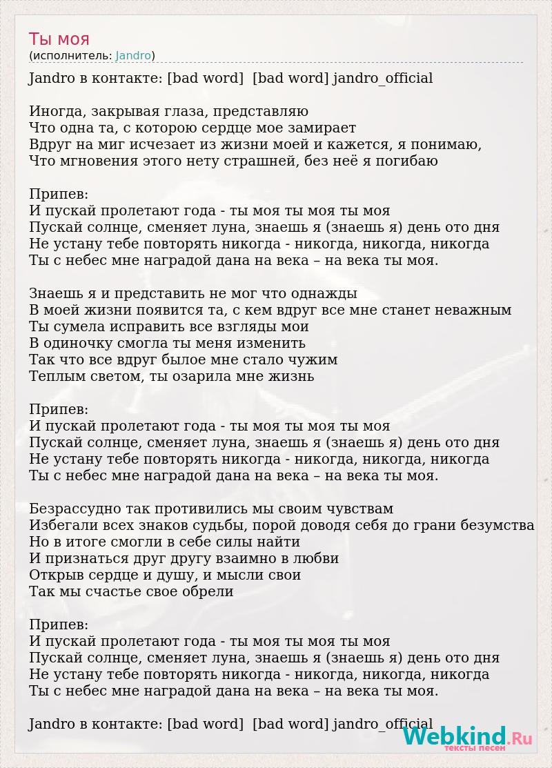 Jandro в контакте: [bad word] [bad word] jandro_official Иногда, закрывая глаза, представляю Что одна та, с которою сердце мое замирает Вдруг на миг исчезает из жизни моей и кажется, я понимаю, Что мгновения этого нету страшней, без неё я погибаю Припев: И пускай пролетают года - ты моя ты моя ты моя Пускай солнце, сменяет луна, знаешь я (знаешь я) день ото дня Не устану тебе повторять никогда - никогда, никогда, никогда Ты с небес мне наградой дана на века – на века ты моя. Знаешь я и представить не мог что однажды В моей жизни появится та, с кем вдруг все мне станет неважным Ты сумела исправить все взгляды мои В одиночку смогла ты меня изменить Так что все вдруг былое мне стало чужим Теплым светом, ты озарила мне жизнь Припев: И пускай пролетают года - ты моя ты моя ты моя Пускай солнце, сменяет луна, знаешь я (знаешь я) день ото дня Не устану тебе повторять никогда - никогда, никогда, никогда Ты с небес мне наградой дана на века – на века ты моя. Безрассудно так противились мы своим чувствам Избегали всех знаков судьбы, порой доводя себя до грани безумства Но в итоге смогли в себе силы найти И признаться друг другу взаимно в любви Открыв сердце и душу, и мысли свои Так мы счастье свое обрели Припев: И пускай пролетают года - ты моя ты моя ты моя Пускай солнце, сменяет луна, знаешь я (знаешь я) день ото дня Не устану тебе повторять никогда - никогда, никогда, никогда Ты с небес мне наградой дана на века – на века ты моя. Jandro в контакте: [bad word] [bad word] jandro_official
