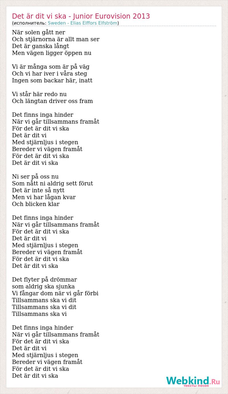 А как ты думаешь, о чем песня "Det är dit vi ska - Junior Eurovision 2013" ?