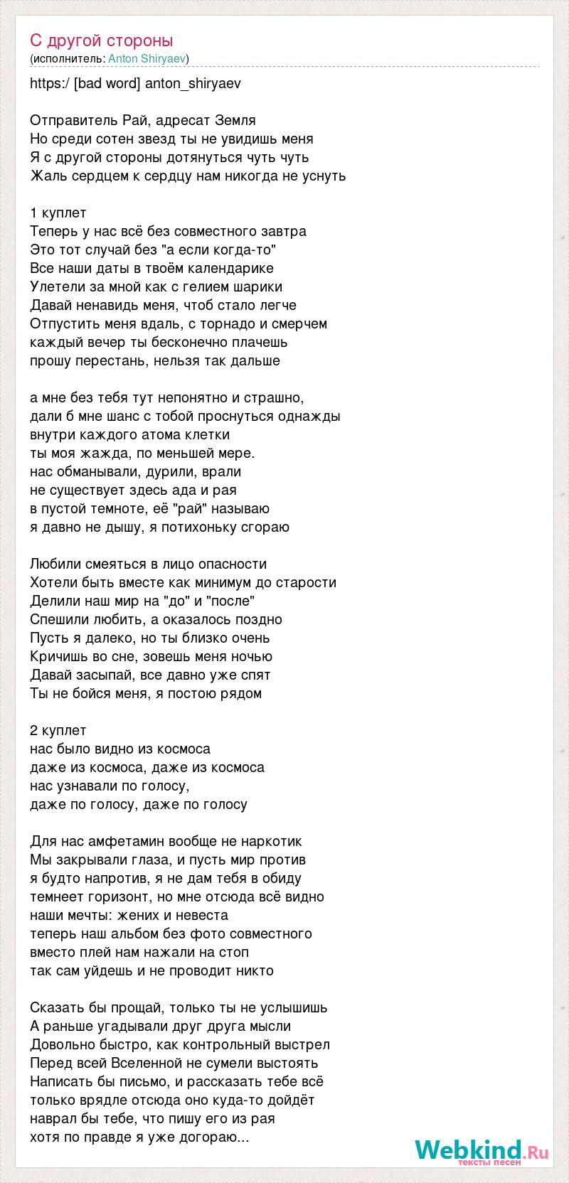 https:/ [bad word] anton_shiryaev Отправитель Рай, адресат Земля Но среди сотен звезд ты не увидишь меня Я с другой стороны дотянуться чуть чуть Жаль сердцем к сердцу нам никогда не уснуть 1 куплет Теперь у нас всё без совместного завтра Это тот случай без "а если когда-то" Все наши даты в твоём календарике Улетели за мной как с гелием шарики Давай ненавидь меня, чтоб стало легче Отпустить меня вдаль, с торнадо и смерчем каждый вечер ты бесконечно плачешь прошу перестань, нельзя так дальше а мне без тебя тут непонятно и страшно, дали б мне шанс с тобой проснуться однажды внутри каждого атома клетки ты моя жажда, по меньшей мере. нас обманывали, дурили, врали не существует здесь ада и рая в пустой темноте, её "рай" называю я давно не дышу, я потихоньку сгораю Любили смеяться в лицо опасности Хотели быть вместе как минимум до старости Делили наш мир на "до" и "после" Спешили любить, а оказалось поздно Пусть я далеко, но ты близко очень Кричишь во сне, зовешь меня ночью Давай засыпай, все давно уже спят Ты не бойся меня, я постою рядом 2 куплет нас было видно из космоса даже из космоса, даже из космоса нас узнавали по голосу, даже по голосу, даже по голосу Для нас амфетамин вообще не наркотик Мы закрывали глаза, и пусть мир против я будто напротив, я не дам тебя в обиду темнеет горизонт, но мне отсюда всё видно наши мечты: жених и невеста теперь наш альбом без фото совместного вместо плей нам нажали на стоп так сам уйдешь и не проводит никто Сказать бы прощай, только ты не услышишь А раньше угадывали друг друга мысли Довольно быстро, как контрольный выстрел Перед всей Вселенной не сумели выстоять Написать бы письмо, и рассказать тебе всё только врядле отсюда оно куда-то дойдёт наврал бы тебе, что пишу его из рая хотя по правде я уже догораю...