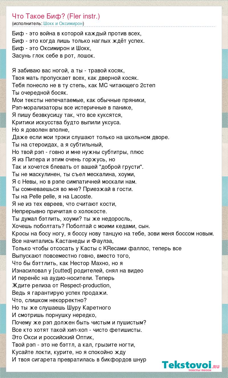 Биф - это война в которой каждый против всех, Биф - это когда лишь только наглых ждёт успех. Биф - это Оксимирон и Шокк, Засунь глок себе в рот, лошок. Я забиваю вас ногой, а ты - травой косяк, Твоя мать пропускает всех, как дверной косяк. Тебя понесло не в ту степь, как MC читающего 2степ Ты очередной босяк. Мои тексты непечатаемые, как обычные пряники, Рэп-морализаторы все истеричные в панике, Я пишу безвкусицу так, что все куксятся, Критики искусства будто выпили уксуса. Но я доволен вполне, Даже если мои трэки слушают только на школьном дворе. Ты на стероидах, а я субтильный, Но твой рэп - говно и мне нужны субтитры, плюс Я из Питера и этим очень горжусь, но Так и хочется блевать от вашей "доброй грусти". Ты не маскулинен, ты съел мескалина, хоуми, Я с Невы, но в рэпе симпатичней москали нам. Ты сомневаешься во мне? Приезжай в гости. Ты на Pelle pelle, я на Lacoste. Я не из тех евреев, что считают кости, Непрерывно причитая о холокосте. Ты думал бэтлить, хоуми? ты же недоросль, Хочешь поболтать? Поболтай с моими кедами, сын. Кросы на босу ногу, я боссу нову танцую на тебе, зови меня боссом новым. Все начитались Кастанеды и Фаулза, Только чтобы отсосать у Касты с KRecами фаллос, теперь все Выпускают повсеместно говно, вместо того, Что бы бэттлить, как Нестор Махно, но я Изнасиловал у [cutted] родителей, снял на видео И перенёс на аудио-носители. Теперь Ждите релиза от Respect-production, Ведь я гарантирую успех продажи. Что, слишком некорректно? Но ты же слушаешь Шуру Каретного И смотришь порнушку нередко, Почему же рэп должен быть чистым и пушистым? Все кто хотят такой хип-хоп - чисто фетишисты. Это Окси и российский Оптик, Твой рэп - это не бэттл, а кал, грызите ногти, Кусайте локти, курите, но я спокойно жду И твоя сигарета превратилась в бикфордов шнур