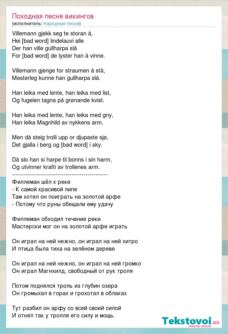 Villemann gjekk seg te storan å, Hei [bad word] lindelauvi alle Der han ville gullharpa slå For de runerne de lyster han å vinne. Villemann gjenge for straumen å stå, Mesterleg kunne han gullharpa slå. Han leika med lente, han leika med list, Og fugelen tagna på grønande kvist. Han leika med lente, han leika med gny, Han leika Magnhild av nykkens arm. Men då steig trolli upp or djupaste sjø, Det gjalla i berg og det runga i sky. Då slo han si harpe til bonns i sin harm, Og utvinner krafti av trollenes arm. ------------------------------------------------ Филлеман шёл к реке - К самой красивой липе Там хотел он поиграть на золотой арфе - Потому что руны обещали ему удачу Филлеман обходил течение реки Мастерски мог он на золотой арфе играть Он играл на ней нежно, он играл на ней хитро И птица была тиха на зелёном дереве Он играл на ней нежно, он играл на ней громко Он играл Магнхилд, свободный от рук троля Потом поднялся троль из глубин озера Он громыхал в горах и грохотал в облаках Тут разбил он арфу со всей своей силой И отнял так у тролля его силу и мощь.