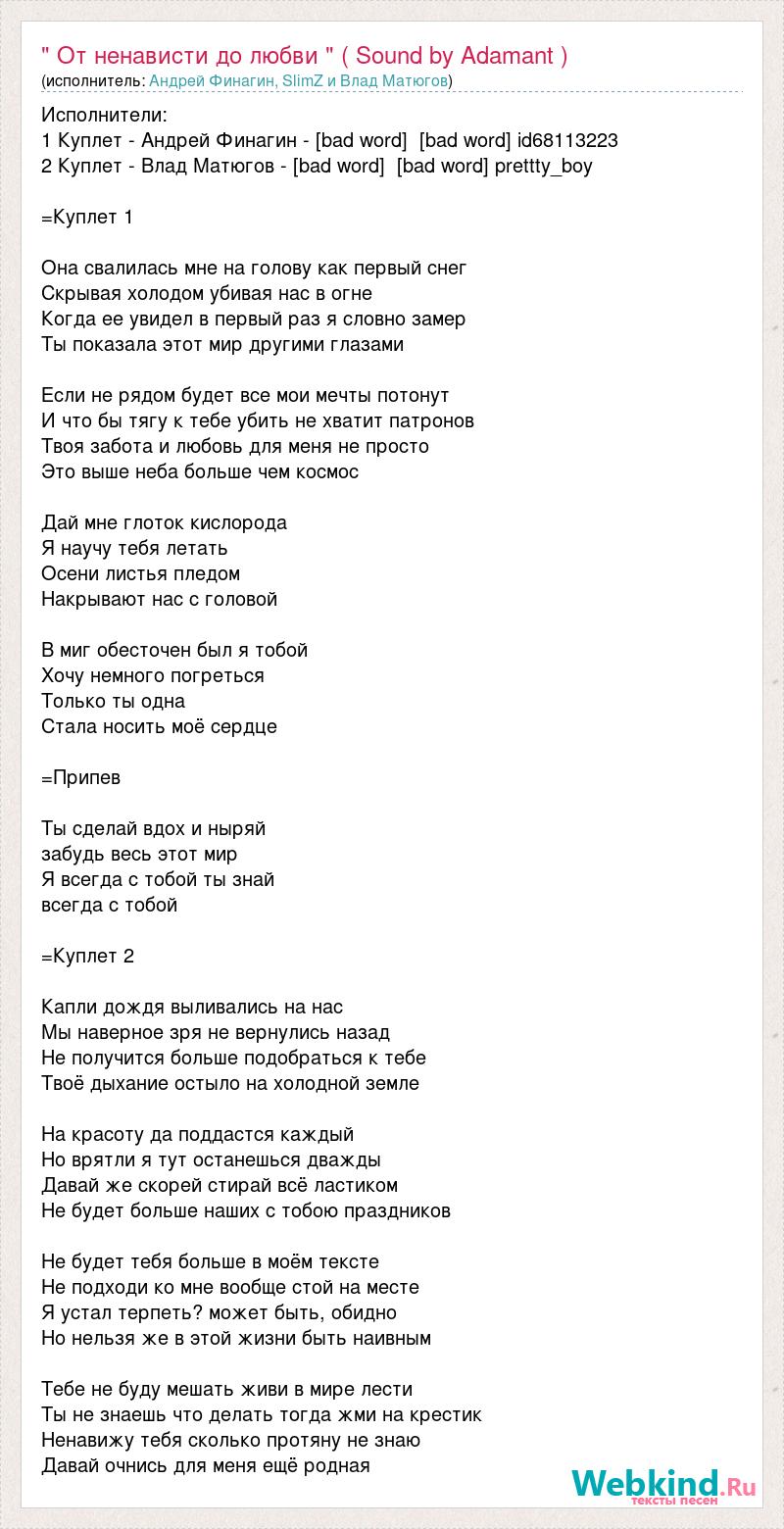 Исполнители: 1 Куплет - Андрей Финагин - [bad word] [bad word] id68113223 2 Куплет - Влад Матюгов - [bad word] [bad word] prettty_boy =Куплет 1 Она свалилась мне на голову как первый снег Скрывая холодом убивая нас в огне Когда ее увидел в первый раз я словно замер Ты показала этот мир другими глазами Если не рядом будет все мои мечты потонут И что бы тягу к тебе убить не хватит патронов Твоя забота и любовь для меня не просто Это выше неба больше чем космос Дай мне глоток кислорода Я научу тебя летать Осени листья пледом Накрывают нас с головой В миг обесточен был я тобой Хочу немного погреться Только ты одна Стала носить моё сердце =Припев Ты сделай вдох и ныряй забудь весь этот мир Я всегда с тобой ты знай всегда с тобой =Куплет 2 Капли дождя выливались на нас Мы наверное зря не вернулись назад Не получится больше подобраться к тебе Твоё дыхание остыло на холодной земле На красоту да поддастся каждый Но врятли я тут останешься дважды Давай же скорей стирай всё ластиком Не будет больше наших с тобою праздников Не будет тебя больше в моём тексте Не подходи ко мне вообще стой на месте Я устал терпеть? может быть, обидно Но нельзя же в этой жизни быть наивным Тебе не буду мешать живи в мире лести Ты не знаешь что делать тогда жми на крестик Ненавижу тебя сколько протяну не знаю Давай очнись для меня ещё родная