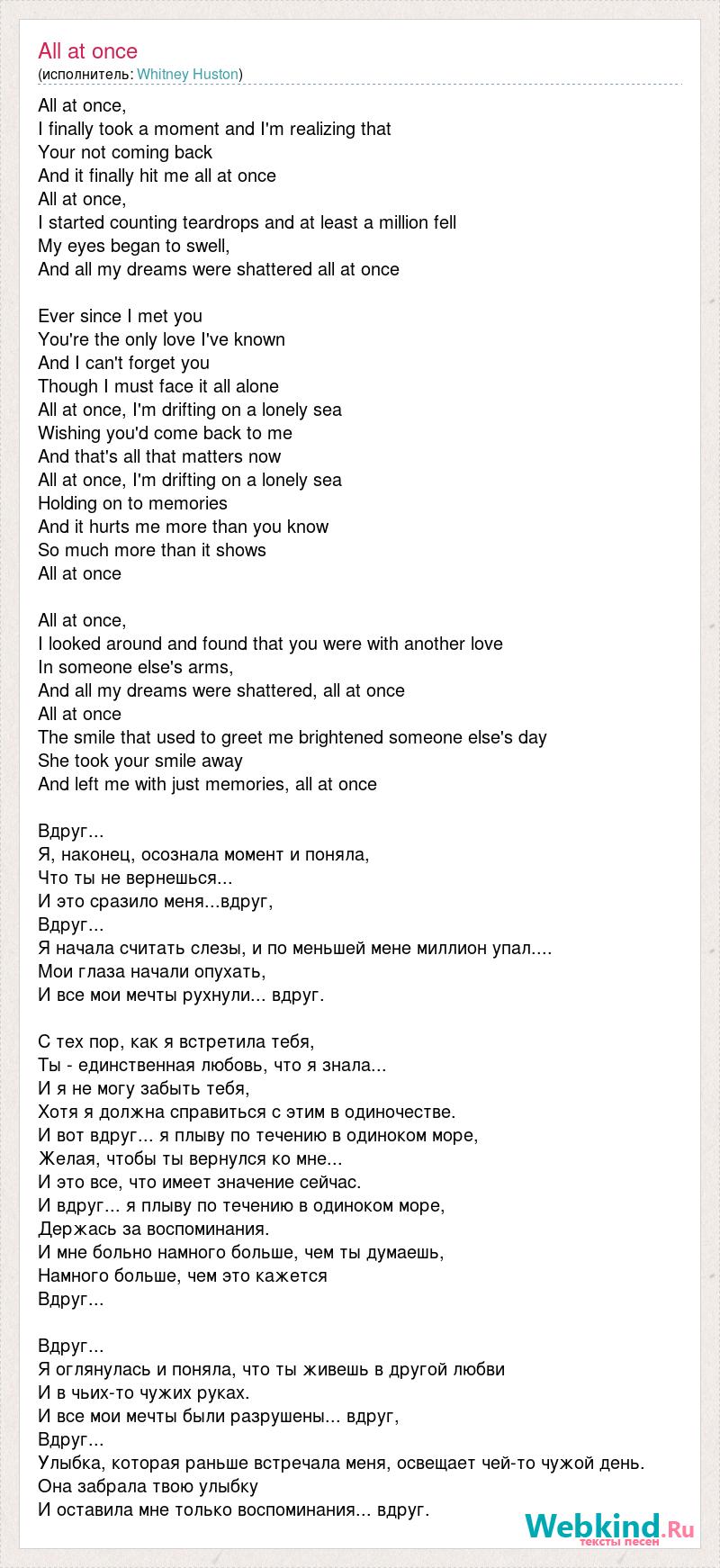 All at once, I finally took a moment and I'm realizing that Your not coming back And it finally hit me all at once All at once, I started counting teardrops and at least a million fell My eyes began to swell, And all my dreams were shattered all at once Ever since I met you You're the only love I've known And I can't forget you Though I must face it all alone All at once, I'm drifting on a lonely seа Wishing you'd come back to me And that's all that matters now All at once, I'm drifting on a lonely sea Holding on to memories And it hurts me more than you know So much more than it shows All at once All at once, I looked around and found that you were with another love In someone else's arms, And all my dreams were shattered, all at once All at once The smile that used to greet me brightened someone else's day She took your smile away And left me with just memories, all at once Вдруг... Я, наконец, осознала момент и поняла, Что ты не вернешься... И это сразило меня...вдруг, Вдруг... Я начала считать слезы, и по меньшей мене миллион упал.... Мои глаза начали опухать, И все мои мечты рухнули... вдруг. С тех пор, как я встретила тебя, Ты - единственная любовь, что я знала... И я не могу забыть тебя, Хотя я должна справиться с этим в одиночестве. И вот вдруг... я плыву по течению в одиноком море, Желая, чтобы ты вернулся ко мне... И это все, что имеет значение сейчас. И вдруг... я плыву по течению в одиноком море, Держась за воспоминания. И мне больно намного больше, чем ты думаешь, Намного больше, чем это кажется Вдруг... Вдруг... Я оглянулась и поняла, что ты живешь в другой любви И в чьих-то чужих руках. И все мои мечты были разрушены... вдруг, Вдруг... Улыбка, которая раньше встречала меня, освещает чей-то чужой день. Она забрала твою улыбку И оставила мне только воспоминания... вдруг.