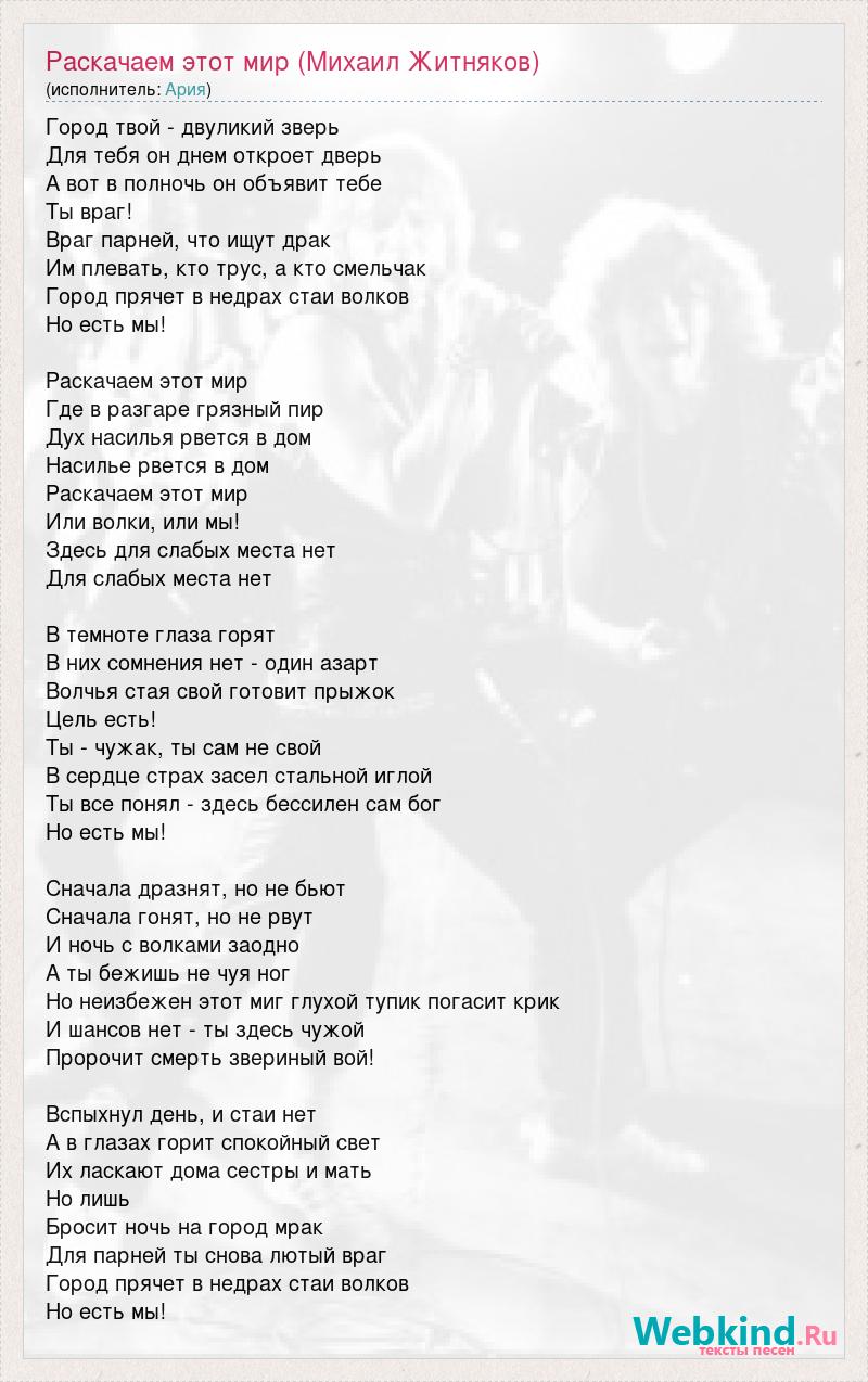 Город твой - двуликий зверь Для тебя он днем откроет дверь А вот в полночь он объявит тебе Ты враг! Враг парней, что ищут драк Им плевать, кто трус, а кто смельчак Город прячет в недрах стаи волков Но есть мы! Раскачаем этот мир Где в разгаре грязный пир Дух насилья рвется в дом Насилье рвется в дом Раскачаем этот мир Или волки, или мы! Здесь для слабых места нет Для слабых места нет В темноте глаза горят В них сомнения нет - один азарт Волчья стая свой готовит прыжок Цель есть! Ты - чужак, ты сам не свой В сердце страх засел стальной иглой Ты все понял - здесь бессилен сам бог Но есть мы! Сначала дразнят, но не бьют Сначала гонят, но не рвут И ночь с волками заодно А ты бежишь не чуя ног Но неизбежен этот миг глухой тупик погасит крик И шансов нет - ты здесь чужой Пророчит смерть звериный вой! Вспыхнул день, и стаи нет А в глазах горит спокойный свет Их ласкают дома сестры и мать Но лишь Бросит ночь на город мрак Для парней ты снова лютый враг Город прячет в недрах стаи волков Но есть мы!