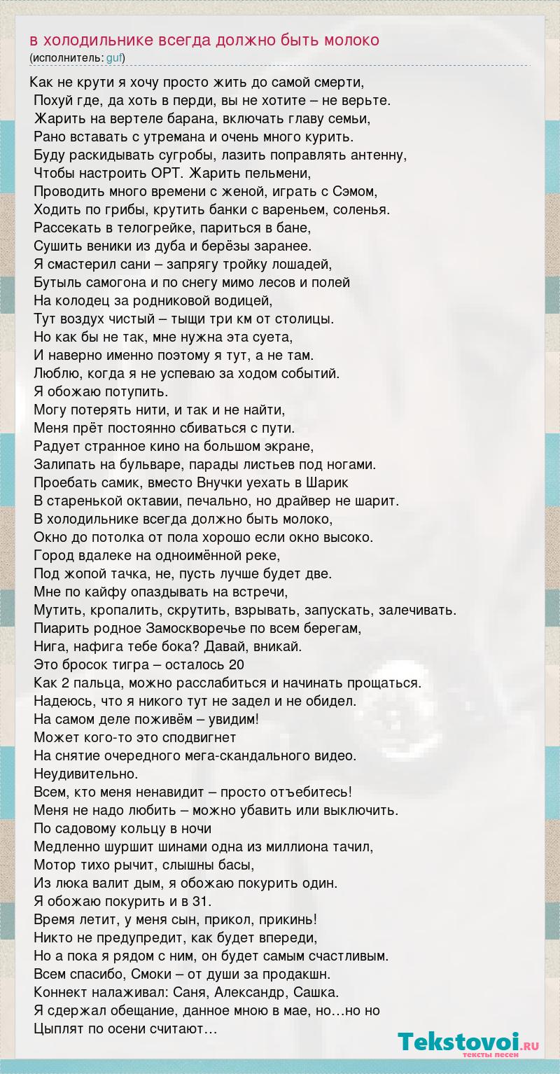 Как не крути я хочу просто жить до самой смерти, Похуй где, да хоть в перди, вы не хотите – не верьте. Жарить на вертеле барана, включать главу семьи, Рано вставать с утремана и очень много курить. Буду раскидывать сугробы, лазить поправлять антенну, Чтобы настроить ОРТ. Жарить пельмени, Проводить много времени с женой, играть с Сэмом, Ходить по грибы, крутить банки с вареньем, соленья. Рассекать в телогрейке, париться в бане, Сушить веники из дуба и берёзы заранее. Я смастерил сани – запрягу тройку лошадей, Бутыль самогона и по снегу мимо лесов и полей На колодец за родниковой водицей, Тут воздух чистый – тыщи три км от столицы. Но как бы не так, мне нужна эта суета, И наверно именно поэтому я тут, а не там. Люблю, когда я не успеваю за ходом событий. Я обожаю потупить. Могу потерять нити, и так и не найти, Меня прёт постоянно сбиваться с пути. Радует странное кино на большом экране, Залипать на бульваре, парады листьев под ногами. Проебать самик, вместо Внучки уехать в Шарик В старенькой октавии, печально, но драйвер не шарит. В холодильнике всегда должно быть молоко, Окно до потолка от пола хорошо если окно высоко. Город вдалеке на одноимённой реке, Под жопой тачка, не, пусть лучше будет две. Мне по кайфу опаздывать на встречи, Мутить, кропалить, скрутить, взрывать, запускать, залечивать. Пиарить родное Замоскворечье по всем берегам, Нига, нафига тебе бока? Давай, вникай. Это бросок тигра – осталось 20 Как 2 пальца, можно расслабиться и начинать прощаться. Надеюсь, что я никого тут не задел и не обидел. На самом деле поживём – увидим! Может кого-то это сподвигнет На снятие очередного мега-скандального видео. Неудивительно. Всем, кто меня ненавидит – просто отъебитесь! Меня не надо любить – можно убавить или выключить. По садовому кольцу в ночи Медленно шуршит шинами одна из миллиона тачил, Мотор тихо рычит, слышны басы, Из люка валит дым, я обожаю покурить один. Я обожаю покурить и в 31. Время летит, у меня сын, прикол, прикинь! Никто не предупредит, как будет впереди, Но а пока я рядом с ним, он будет самым счастливым. Всем спасибо, Смоки – от души за продакшн. Коннект налаживал: Саня, Александр, Сашка. Я сдержал обещание, данное мною в мае, но…но но Цыплят по осени считают…