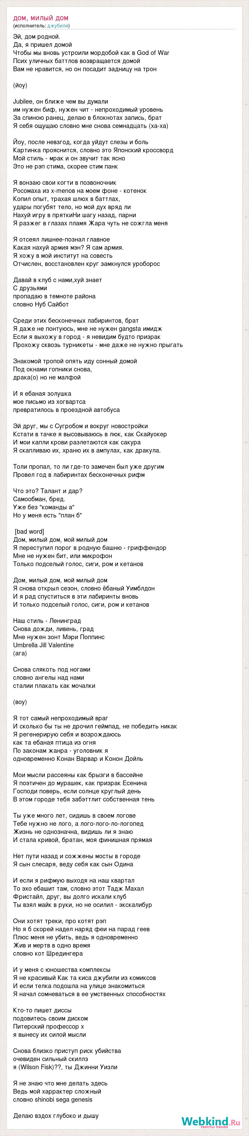 Эй, дом родной. Да, я пришел домой Чтобы мы вновь устроили мордобой как в God of War Псих уличных баттлов возвращается домой Вам не нравится, но он посадит задницу на трон (йоу) Jubilee, он ближе чем вы думали им нужен биф, нужен чит - непроходимый уровень За спиною ранец, делаю в блокнотах запись, брат Я себя ощущаю словно мне снова семнадцать (ха-ха) Йоу, после невзгод, когда уйдут слезы и боль Картинка прояснится, словно это Японский кроссворд Мой стиль - мрак и он звучит так ясно Это не рэп стима, скорее стим панк Я вонзаю свои когти в позвоночник Росомаха из x-menов на моем фоне - котенок Копил опыт, трахая шлюх в баттлах, удары погубят тело, но мой дух вряд ли Нахуй игру в пряткиНи шагу назад, парни Я разжег в глазах пламя Жара чуть не сожгла меня Я отсеял лишнее-познал главное Какая нахуй армия мэн? Я сам армия. Я хожу в мой институт на совесть Отчислен, восстановлен круг замкнулся уроборос Давай в клуб с нами,хуй знает С друзьями пропадаю в темноте района словно Нуб Сайбот Среди этих бесконечных лабиринтов, брат Я даже не понтуюсь, мне не нужен gangsta имидж Если я выхожу в город - я невидим будто призрак Прохожу сквозь турникеты - мне даже не нужно прыгать Знакомой тропой опять иду сонный домой Под окнами гопники снова, драка(о) но не малфой И я ебаная золушка мое письмо из хогвартса превратилось в проездной автобуса Эй друг, мы с Сугробом и вокруг новостройки Кстати в тачке я высовываюсь в люк, как Скайуокер И мои капли крови разлетаются как сакура Я скапливаю их, храню их в ампулах, как дракула. Толи пропал, то ли где-то замечен был уже другим Провел год в лабиринтах бесконечных рифм Что это? Талант и дар? Самообман, бред. Уже без "команды а" Но у меня есть "план б" [bad word] Дом, милый дом, мой милый дом Я переступил порог в родную башню - гриффендор Мне не нужен бит, или микрофон Только подселый голос, сиги, ром и кетанов Дом, милый дом, мой милый дом Я снова открыл сезон, словно ёбаный Уимблдон И я рад спуститься в эти лабиринты вновь И только подселый голос, сиги, ром и кетанов Наш стиль - Ленинград Снова дожди, ливень, град Мне нужен зонт Мэри Поппинс Umbrella Jill Valentine (ага) Снова слякоть под ногами словно ангелы над нами сталии плакать как мочалки (воу) Я тот самый непроходимый враг И сколько бы ты не дрочил геймпад, не победить никак Я регенерирую себя и возрождаюсь как та ебаная птица из огня По законам жанра - уголовник я одновременно Конан Варвар и Конон Дойль Мои мысли рассеяны как брызги в бассейне Я поэтичен до мурашек, как призрак Есенина Господи поверь, если солнце круглый день В этом городе тебя забэттлит собственная тень Ты уже много лет, сидишь в своем логове Тебе нужно не лого, а лого-лого-ло-логопед Жизнь не однозначна, видишь ли я знаю И стала кривой, братан, моя финишная прямая Нет пути назад и сожжены мосты в городе Я сын слесаря, веду себя как сын Одина И если я рифмую выходя на наш квартал То эхо ебашит там, словно этот Тадж Махал Фристайл, друг, вы долго искали клуб Ты взял майк в руки, но не осилил - экскалибур Они хотят треки, про котят рэп Но я б скорей надел наряд феи на парад геев Плюс меня не убить, ведь я одновременно Жив и мертв в одно время словно кот Шредингера И у меня с юношества комплексы Я не красивый Как та киса джубили из комиксов И если телка подошла на улице знакомиться Я начал сомневаться в ее умственных способностях Кто-то пишет диссы подовитесь 