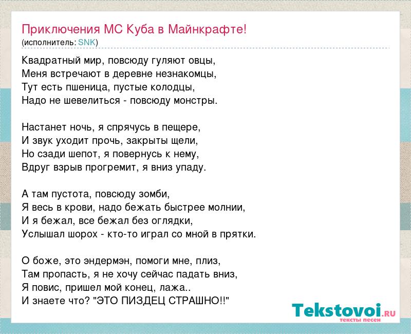 Квадратный мир, повсюду гуляют овцы, Меня встречают в деревне незнакомцы, Тут есть пшеница, пустые колодцы, Надо не шевелиться - повсюду монстры. Настанет ночь, я спрячусь в пещере, И звук уходит прочь, закрыты щели, Но сзади шепот, я повернусь к нему, Вдруг взрыв прогремит, я вниз упаду. А там пустота, повсюду зомби, Я весь в крови, надо бежать быстрее молнии, И я бежал, все бежал без оглядки, Услышал шорох - кто-то играл со мной в прятки. О боже, это эндермэн, помоги мне, плиз, Там пропасть, я не хочу сейчас падать вниз, Я повис, пришел мой конец, лажа.. И знаете что? "ЭТО ПИЗДЕЦ СТРАШНО!!"