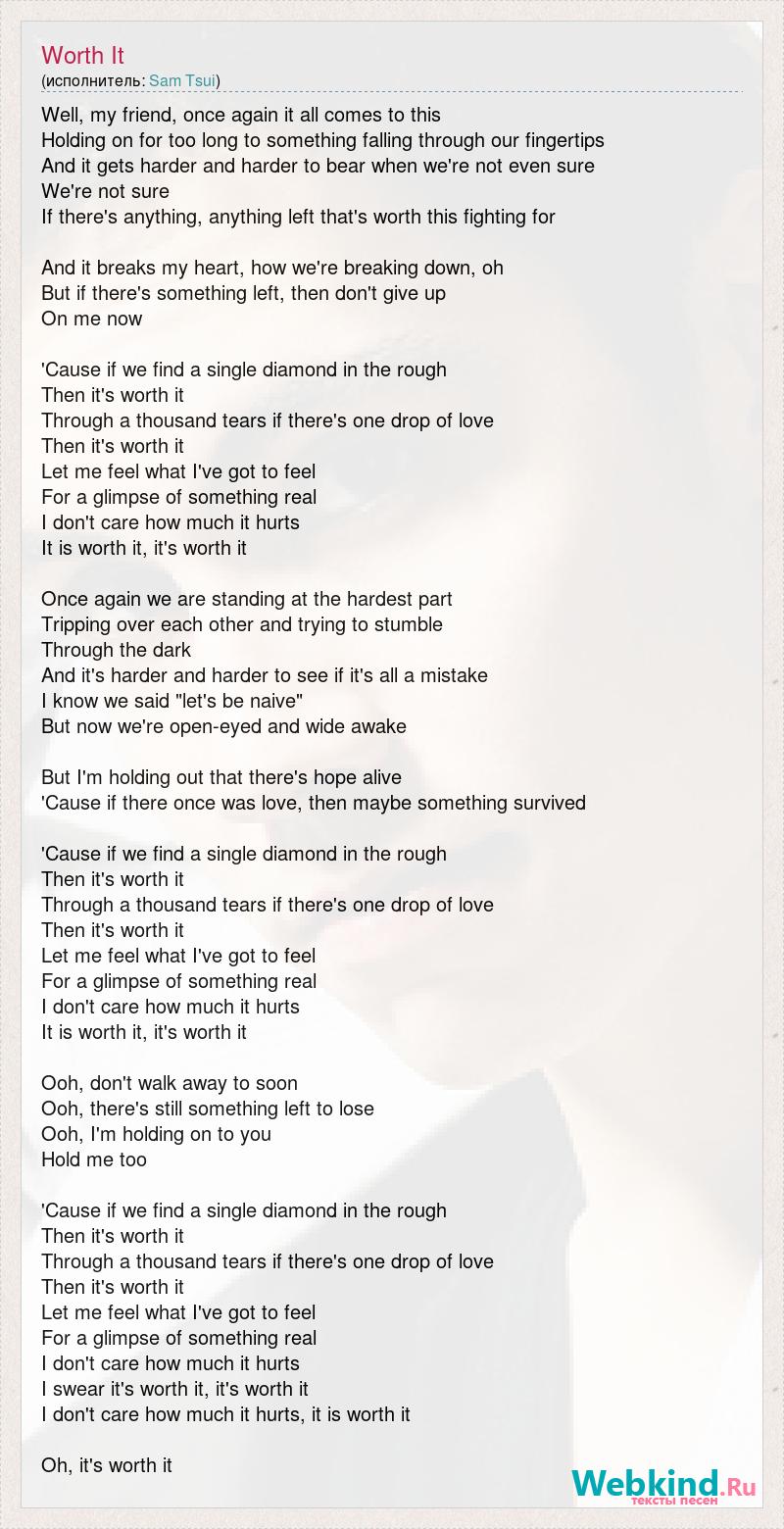 Well, my friend, once again it all comes to this Holding on for too long to something falling through our fingertips And it gets harder and harder to bear when we're not even sure We're not sure If there's anything, anything left that's worth this fighting for And it breaks my heart, how we're breaking down, oh But if there's something left, then don't give up On me now 'Cause if we find a single diamond in the rough Then it's worth it Through a thousand tears if there's one drop of love Then it's worth it Let me feel what I've got to feel For a glimpse of something real I don't care how much it hurts It is worth it, it's worth it Once again we are standing at the hardest part Tripping over each other and trying to stumble Through the dark And it's harder and harder to see if it's all a mistake I know we said "let's be naive" But now we're open-eyed and wide awake But I'm holding out that there's hope alive 'Cause if there once was love, then maybe something survived 'Cause if we find a single diamond in the rough Then it's worth it Through a thousand tears if there's one drop of love Then it's worth it Let me feel what I've got to feel For a glimpse of something real I don't care how much it hurts It is worth it, it's worth it Ooh, don't walk away to soon Ooh, there's still something left to lose Ooh, I'm holding on to you Hold me too 'Cause if we find a single diamond in the rough Then it's worth it Through a thousand tears if there's one drop of love Then it's worth it Let me feel what I've got to feel For a glimpse of something real I don't care how much it hurts I swear it's worth it, it's worth it I don't care how much it hurts, it is worth it Oh, it's worth it