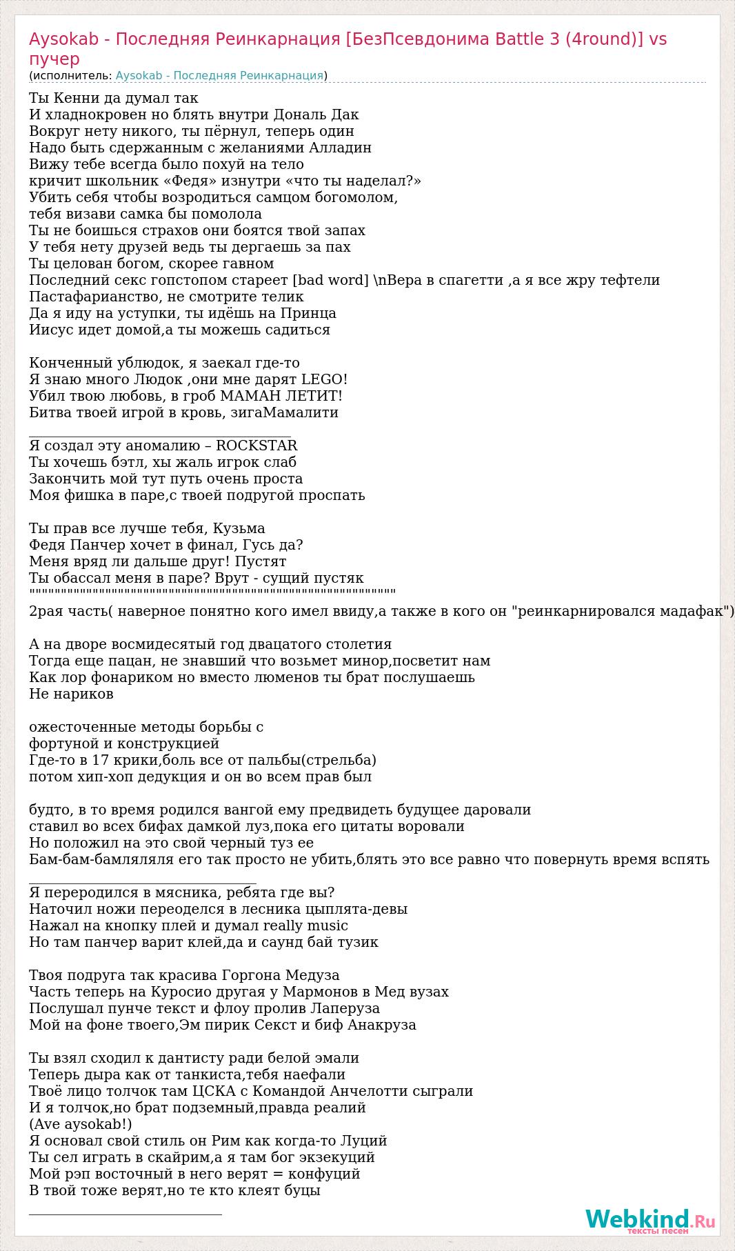 Ты Кенни да думал так И хладнокровен но блять внутри Дональ Дак Вокруг нету никого, ты пёрнул, теперь один Надо быть сдержанным с желаниями Алладин Вижу тебе всегда было похуй на тело кричит школьник «Федя» изнутри «что ты наделал?» Убить себя чтобы возродиться самцом богомолом, тебя визави самка бы помолола Ты не боишься страхов они боятся твой запах У тебя нету друзей ведь ты дергаешь за пах Ты целован богом, скорее гавном Последний секс гопстопом стареет [bad word] \nВера в спагетти ,а я все жру тефтели Пастафарианство, не смотрите телик Да я иду на уступки, ты идёшь на Принца Иисус идет домой,а ты можешь садиться Конченный ублюдок, я заекал где-то Я знаю много Людок ,они мне дарят LEGO! Убил твою любовь, в гроб МАМАН ЛЕТИТ! Битва твоей игрой в кровь, зигаМамалити ______________________________________ Я создал эту аномалию – ROCKSTAR Ты хочешь бэтл, хы жаль игрок слаб Закончить мой тут путь очень проста Моя фишка в паре,с твоей подругой проспать Ты прав все лучше тебя, Кузьма Федя Панчер хочет в финал, Гусь да? Меня вряд ли дальше друг! Пустят Ты обассал меня в паре? Врут - сущий пустяк """""""""""""""""""""""""""""""""""""""""""""""""""""""""" 2рая часть( наверное понятно кого имел ввиду,а также в кого он "реинкарнировался мадафак") А на дворе восмидесятый год двацатого столетия Тогда еще пацан, не знавший что возьмет минор,посветит нам Как лор фонариком но вместо люменов ты брат послушаешь Не нариков ожесточенные методы борьбы с фортуной и конструкцией Где-то в 17 крики,боль все от пальбы(стрельба) потом хип-хоп дедукция и он во всем прав был будто, в то время родился вангой ему предвидеть будущее даровали ставил во всех бифах дамкой луз,пока его цитаты воровали Но положил на это свой черный туз ее Бам-бам-бамляляля его так просто не убить,блять это все равно что повернуть время вспять _________________________________ Я переродился в мясника, ребята где вы? Наточил ножи переоделся в лесника цыплята-девы Нажал на кнопку плей и думал really music Но там панчер варит клей,да и саунд бай тузик Твоя подруга так красива Горгона Медуза Часть теперь на Куросио другая у Мармонов в Мед вузах Послушал пунче текст и флоу пролив Лаперуза Мой на фоне твоего,Эм пирик Секст и биф Анакруза Ты взял сходил к дантисту ради белой эмали Теперь дыра как от танкиста,тебя наефали Твоё лицо толчок там ЦСКА с Командой Анчелотти сыграли И я толчок,но брат подземный,правда реалий (Ave aysokab!) Я основал свой стиль он Рим как когда-то Луций Ты сел играть в скайрим,а я там бог экзекуций Мой рэп восточный в него верят = конфуций В твой тоже верят,но те кто клеят буцы ____________________________