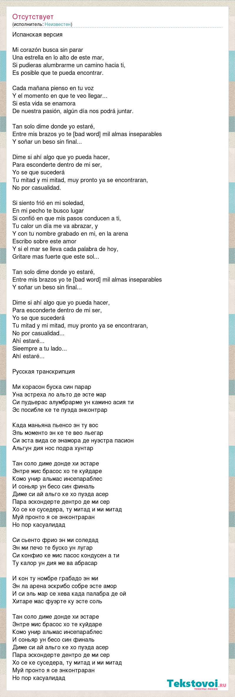 Испанская версия Mi corazón busca sin parar Una estrella en lo alto de este mar, Si pudieras alumbrarme un camino hacia ti, Es posible que te pueda encontrar. Cada mañana pienso en tu voz Y el momento en que te veo llegar... Si esta vida se enamora De nuestra pasión, algún día nos podrá juntar. Tan solo dime donde yo estaré, Entre mis brazos yo te cuidare... Como mil almas inseparables Y soñar un beso sin final... Dime si ahí algo que yo pueda hacer, Para esconderte dentro de mi ser, Yo se que sucederá Tu mitad y mi mitad, muy pronto ya se encontraran, No por casualidad. Si siento frió en mi soledad, En mi pecho te busco lugar Si confió en que mis pasos conducen a ti, Tu calor un día me va abrazar, y Y con tu nombre grabado en mi, en la arena Escribo sobre este amor Y si el mar se lleva cada palabra de hoy, Gritare mas fuerte que este sol... Tan solo dime donde yo estaré, Entre mis brazos yo te cuidare... Como mil almas inseparables Y soñar un beso sin final... Dime si ahí algo que yo pueda hacer, Para esconderte dentro de mi ser, Yo se que sucederá Tu mitad y mi mitad, muy pronto ya se encontraran, No por casualidad... Ahí estaré... Sieempre a tu lado... Ahí estaré... Русская транскрипция Ми корасон буска син парар Уна эстреха ло альто де эсте мар Си пудьерас алумбрарме ун камино асия ти Эс посибле ке те пуэда энконтрар Када маньяна пьенсо эн ту вос Эль моменто эн ке те вео льегар Си эста вида се энамора де нуэстра пасион Альгун дия нос подра хунтар Тан соло диме донде хи эстаре Энтре мис брасос хо те куйдаре Комо унир альмас инсепараблес И соньяр ун бесо син финаль Диме си ай альго ке хо пуэда асер Пара эскондерте дентро де ми сер Хо се ке суседера, ту митад и ми митад Муй пронто я се энконтраран Но пор касуалидад Си сьенто фрио эн ми соледад Эн ми печо те буско ун лугар Си конфио ке мис пасос кондусен а ти Ту калор ун дия ме ва абрасар И кон ту номбре грабадо эн ми Эн ла арена эскрибо собре эсте амор И си эль мар се хева када палабра де ой Хитаре мас фуэрте ку эсте соль Тан соло диме донде хи эстаре Энтре мис брасос хо те куйдаре Комо унир альмас инсепараблес И соньяр ун бесо син финаль Диме си ай альго ке хо пуэда асер Пара эскондерте дентро де ми сер Хо се ке суседера, ту митад и ми митад Муй пронто я се энконтраран Но пор касуалидад