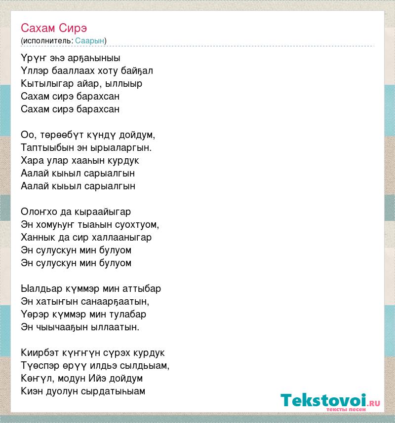 Үрүҥ эһэ арҕаһыныы Үллэр бааллаах хоту байҕал Кытылыгар айар, ыллыыр Сахам сирэ барахсан Сахам сирэ барахсан Оо, төрөөбүт күндү дойдум, Таптыыбын эн ырыаларгын. Хара улар хааһын курдук Аалай кыһыл сарыалгын Аалай кыьыл сарыалгын Олоҥхо да кыраайыгар Эн хомуһуҥ тыаһын суохтуом, Ханнык да сир халлааныгар Эн сулускун мин булуом Эн сулускун мин булуом Ыалдьар күммэр мин аттыбар Эн хатыҥын санаарҕаатын, Үөрэр күммэр мин тулабар Эн чыычааҕын ыллаатын. Киирбэт күҥҥүн сүрэх курдук Түөспэр өрүү илдьэ сылдьыам, Көҥүл, модун Ийэ дойдум Киэн дуолун сырдатыһыам