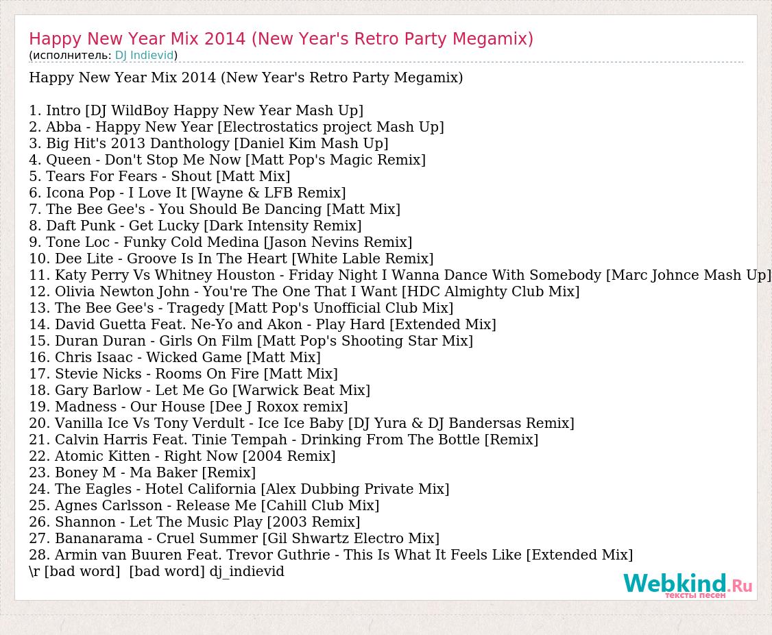 Happy New Year Mix 2014 (New Year's Retro Party Megamix) 1. Intro [DJ WildBoy Happy New Year Mash Up] 2. Abba - Happy New Year [Electrostatics project Mash Up] 3. Big Hit's 2013 Danthology [Daniel Kim Mash Up] 4. Queen - Don't Stop Me Now [Matt Pop's Magic Remix] 5. Tears For Fears - Shout [Matt Mix] 6. Icona Pop - I Love It [Wayne & LFB Remix] 7. The Bee Gee's - You Should Be Dancing [Matt Mix] 8. Daft Punk - Get Lucky [Dark Intensity Remix] 9. Tone Loc - Funky Cold Medina [Jason Nevins Remix] 10. Dee Lite - Groove Is In The Heart [White Lable Remix] 11. Katy Perry Vs Whitney Houston - Friday Night I Wanna Dance With Somebody [Marc Johnce Mash Up] 12. Olivia Newton John - You're The One That I Want [HDC Almighty Club Mix] 13. The Bee Gee's - Tragedy [Matt Pop's Unofficial Club Mix] 14. David Guetta Feat. Ne-Yo and Akon - Play Hard [Extended Mix] 15. Duran Duran - Girls On Film [Matt Pop's Shooting Star Mix] 16. Chris Isaac - Wicked Game [Matt Mix] 17. Stevie Nicks - Rooms On Fire [Matt Mix] 18. Gary Barlow - Let Me Go [Warwick Beat Mix] 19. Madness - Our House [Dee J Roxox remix] 20. Vanilla Ice Vs Tony Verdult - Ice Ice Baby [DJ Yura & DJ Bandersas Remix] 21. Calvin Harris Feat. Tinie Tempah - Drinking From The Bottle [Remix] 22. Atomic Kitten - Right Now [2004 Remix] 23. Boney M - Ma Baker [Remix] 24. The Eagles - Hotel California [Alex Dubbing Private Mix] 25. Agnes Carlsson - Release Me [Cahill Club Mix] 26. Shannon - Let The Music Play [2003 Remix] 27. Bananarama - Cruel Summer [Gil Shwartz Electro Mix] 28. Armin van Buuren Feat. Trevor Guthrie - This Is What It Feels Like [Extended Mix] \r [bad word] [bad word] dj_indievid