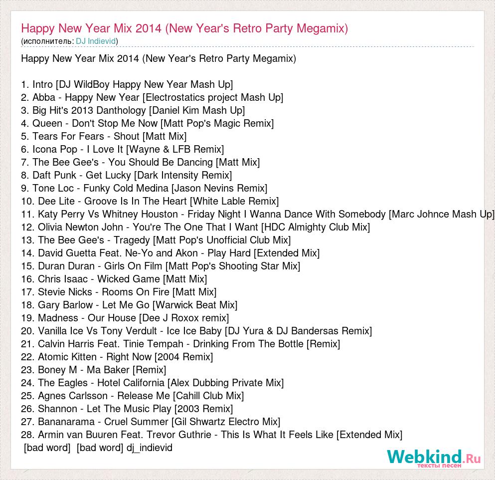 Happy New Year Mix 2014 (New Year's Retro Party Megamix) 1. Intro [DJ WildBoy Happy New Year Mash Up] 2. Abba - Happy New Year [Electrostatics project Mash Up] 3. Big Hit's 2013 Danthology [Daniel Kim Mash Up] 4. Queen - Don't Stop Me Now [Matt Pop's Magic Remix] 5. Tears For Fears - Shout [Matt Mix] 6. Icona Pop - I Love It [Wayne & LFB Remix] 7. The Bee Gee's - You Should Be Dancing [Matt Mix] 8. Daft Punk - Get Lucky [Dark Intensity Remix] 9. Tone Loc - Funky Cold Medina [Jason Nevins Remix] 10. Dee Lite - Groove Is In The Heart [White Lable Remix] 11. Katy Perry Vs Whitney Houston - Friday Night I Wanna Dance With Somebody [Marc Johnce Mash Up] 12. Olivia Newton John - You're The One That I Want [HDC Almighty Club Mix] 13. The Bee Gee's - Tragedy [Matt Pop's Unofficial Club Mix] 14. David Guetta Feat. Ne-Yo and Akon - Play Hard [Extended Mix] 15. Duran Duran - Girls On Film [Matt Pop's Shooting Star Mix] 16. Chris Isaac - Wicked Game [Matt Mix] 17. Stevie Nicks - Rooms On Fire [Matt Mix] 18. Gary Barlow - Let Me Go [Warwick Beat Mix] 19. Madness - Our House [Dee J Roxox remix] 20. Vanilla Ice Vs Tony Verdult - Ice Ice Baby [DJ Yura & DJ Bandersas Remix] 21. Calvin Harris Feat. Tinie Tempah - Drinking From The Bottle [Remix] 22. Atomic Kitten - Right Now [2004 Remix] 23. Boney M - Ma Baker [Remix] 24. The Eagles - Hotel California [Alex Dubbing Private Mix] 25. Agnes Carlsson - Release Me [Cahill Club Mix] 26. Shannon - Let The Music Play [2003 Remix] 27. Bananarama - Cruel Summer [Gil Shwartz Electro Mix] 28. Armin van Buuren Feat. Trevor Guthrie - This Is What It Feels Like [Extended Mix] [bad word] [bad word] dj_indievid