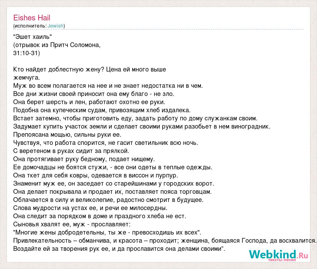 "Эшет хаиль" (отрывок из Притч Соломона, 31:10-31) Кто найдет доблестную жену? Цена ей много выше жемчуга. Муж во всем полагается на нее и не знает недостатка ни в чем. Все дни жизни своей приносит она ему благо - не зло. Она берет шерсть и лен, работают охотно ее руки. Подобна она купеческим судам, привозящим хлеб издалека. Встает затемно, чтобы приготовить еду, задать работу по дому служанкам своим. Задумает купить участок земли и сделает своими руками разобьет в нем виноградник. Препоясана мощью, сильны руки ее. Чувствуя, что работа спорится, не гасит светильник всю ночь. С веретеном в руках сидит за прялкой. Она протягивает руку бедному, подает нищему. Ее домочадцы не боятся стужи, - все они одеты в теплые одежды. Она ткет для себя ковры, одевается в виссон и пурпур. Знаменит муж ее, он заседает со старейшинами у городских ворот. Она делает покрывала и продает их, поставляет пояса торговцам. Облачается в силу и великолепие, радостно смотрит в будущее. Слова мудрости на устах ее, и речи ее милосердны. Она следит за порядком в доме и праздного хлеба не ест. Сыновья хвалят ее, муж - прославляет: "Многие жены добродетельны, ты же - превосходишь их всех". Привлекательность – обманчива, и красота – проходит; женщина, боящаяся Господа, да восхвалится. Воздайте ей за творения рук ее, и да прославится она делами своими”.