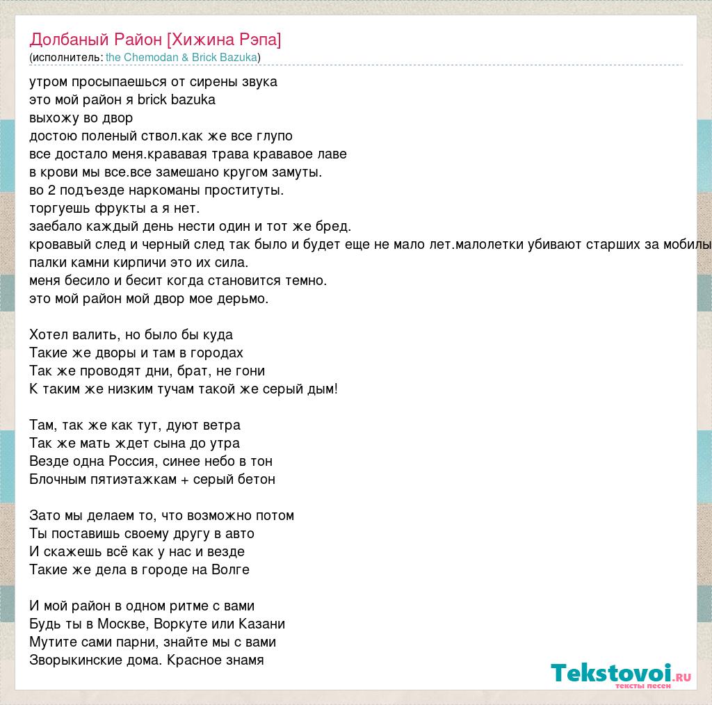 утром просыпаешься от сирены звука это мой район я brick bazuka выхожу во двор достою поленый ствол.как же все глупо все достало меня.крававая трава крававое лаве в крови мы все.все замешано кругом замуты. во 2 подъезде наркоманы проституты. торгуешь фрукты а я нет. заебало каждый день нести один и тот же бред. кровавый след и черный след так было и будет еще не мало лет.малолетки убивают старших за мобилы палки камни кирпичи это их сила. меня бесило и бесит когда становится темно. это мой район мой двор мое дерьмо. Хотел валить, но было бы куда Такие же дворы и там в городах Так же проводят дни, брат, не гони К таким же низким тучам такой же серый дым! Там, так же как тут, дуют ветра Так же мать ждет сына до утра Везде одна Россия, синее небо в тон Блочным пятиэтажкам + серый бетон Зато мы делаем то, что возможно потом Ты поставишь своему другу в авто И скажешь всё как у нас и везде Такие же дела в городе на Волге И мой район в одном ритме с вами Будь ты в Москве, Воркуте или Казани Мутите сами парни, знайте мы с вами Зворыкинские дома. Красное знамя