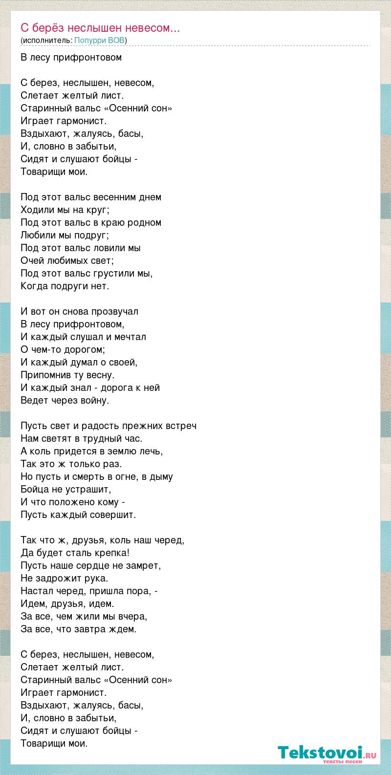 В лесу прифронтовом С берез, неслышен, невесом, Слетает желтый лист. Старинный вальс «Осенний сон» Играет гармонист. Вздыхают, жалуясь, басы, И, словно в забытьи, Сидят и слушают бойцы - Товарищи мои. Под этот вальс весенним днем Ходили мы на круг; Под этот вальс в краю родном Любили мы подруг; Под этот вальс ловили мы Очей любимых свет; Под этот вальс грустили мы, Когда подруги нет. И вот он снова прозвучал В лесу прифронтовом, И каждый слушал и мечтал О чем-то дорогом; И каждый думал о своей, Припомнив ту весну. И каждый знал - дорога к ней Ведет через войну. Пусть свет и радость прежних встреч Нам светят в трудный час. А коль придется в землю лечь, Так это ж только раз. Но пусть и смерть в огне, в дыму Бойца не устрашит, И что положено кому - Пусть каждый совершит. Так что ж, друзья, коль наш черед, Да будет сталь крепка! Пусть наше сердце не замрет, Не задрожит рука. Настал черед, пришла пора, - Идем, друзья, идем. За все, чем жили мы вчера, За все, что завтра ждем. С берез, неслышен, невесом, Слетает желтый лист. Старинный вальс «Осенний сон» Играет гармонист. Вздыхают, жалуясь, басы, И, словно в забытьи, Сидят и слушают бойцы - Товарищи мои.