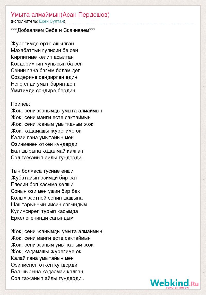 ***Добавляем Себе и Скачиваем*** Журегимде ерте ашылган Махабаттын гулисин бе сен Кирпигиме келип асылган Коздеримнин мунысын ба сен Сенин гана багым болам деп Создерине сендирген един Неге енди умыт барин деп Умитимди сондире бердин Припев: Жок, сени жанымды умыта алмаймын, Жок, сени манги есте сактаймын Жок, сени жаным умытканым жок Жок, кадамашы журегиме ок Калай гана умытайын мен Озинменен откен кундерди Бал шырына кадалмай калган Сол гажайып айлы тундерди.. Тын болмаса тусиме енши Жубатайын озимди бир сат Елесин боп касыма келши Сонын ози мен ушин бир бак Колым жетпей сенин шашына Шаштарыннын иисин сагындым Кулимсиреп турып касымда Еркелегенинди сагындым Жок, сени жанымды умыта алмаймын, Жок, сени манги есте сактаймын Жок, сени жаным умытканым жок Жок, кадамашы журегиме ок Калай гана умытайын мен Озинменен откен кундерди Бал шырына кадалмай калган Сол гажайып айлы тундерди..