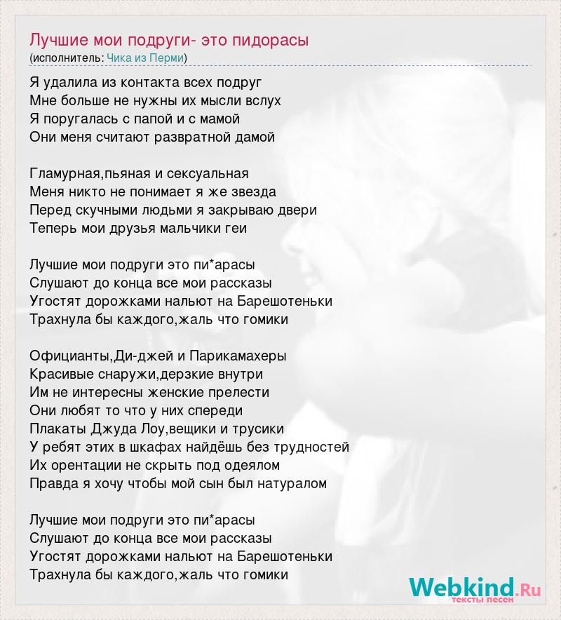 Я удалила из контакта всех подруг Мне больше не нужны их мысли вслух Я поругалась с папой и с мамой Они меня считают развратной дамой Гламурная,пьяная и сексуальная Меня никто не понимает я же звезда Перед скучными людьми я закрываю двери Теперь мои друзья мальчики геи Лучшие мои подруги это пи*арасы Слушают до конца все мои рассказы Угостят дорожками нальют на Барешотеньки Трахнула бы каждого,жаль что гомики Официанты,Ди-джей и Парикамахеры Красивые снаружи,дерзкие внутри Им не интересны женские прелести Они любят то что у них спереди Плакаты Джуда Лоу,вещики и трусики У ребят этих в шкафах найдёшь без трудностей Их орентации не скрыть под одеялом Правда я хочу чтобы мой сын был натуралом Лучшие мои подруги это пи*арасы Слушают до конца все мои рассказы Угостят дорожками нальют на Барешотеньки Трахнула бы каждого,жаль что гомики