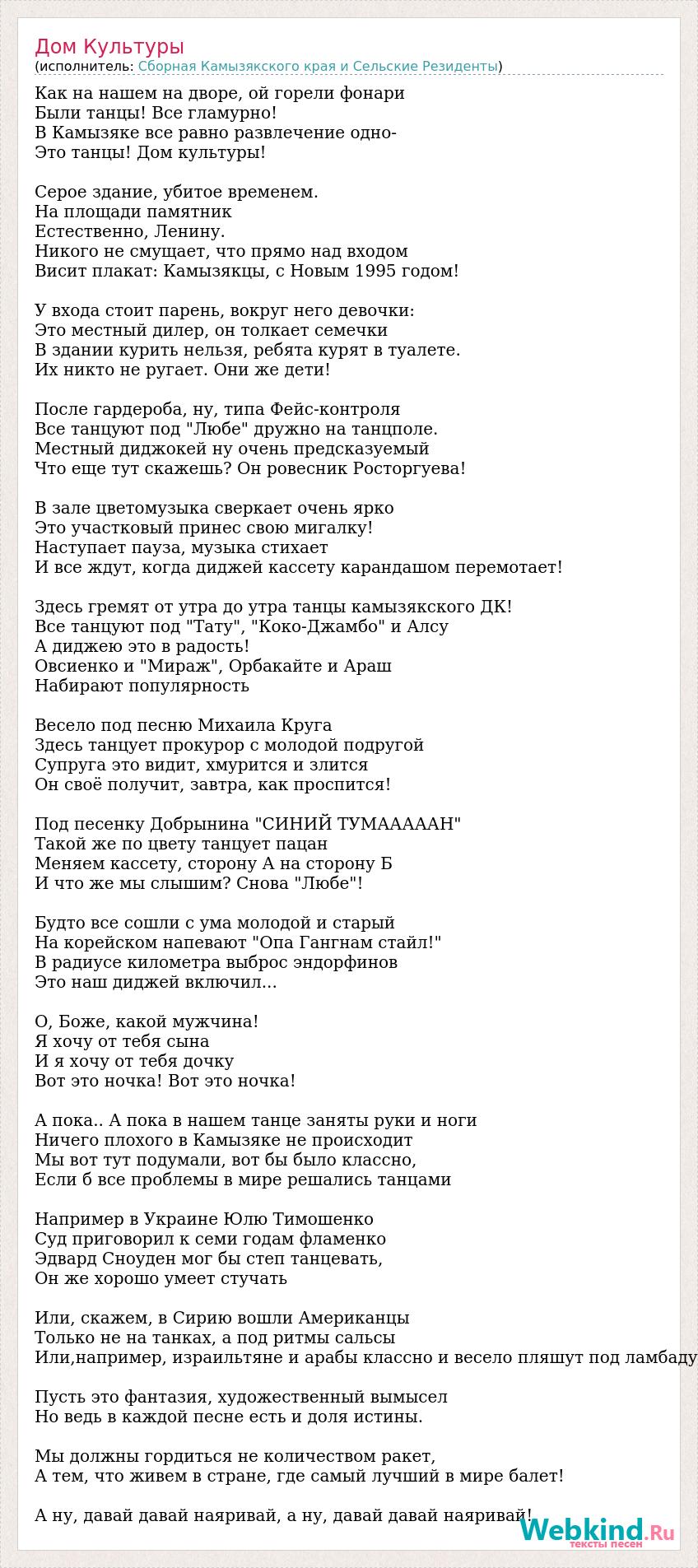 Как на нашем на дворе, ой горели фонари Были танцы! Все гламурно! В Камызяке все равно развлечение одно- Это танцы! Дом культуры! Серое здание, убитое временем. На площади памятник Естественно, Ленину. Никого не смущает, что прямо над входом Висит плакат: Камызякцы, с Новым 1995 годом! У входа стоит парень, вокруг него девочки: Это местный дилер, он толкает семечки В здании курить нельзя, ребята курят в туалете. Их никто не ругает. Они же дети! После гардероба, ну, типа Фейс-контроля Все танцуют под "Любе" дружно на танцполе. Местный диджокей ну очень предсказуемый Что еще тут скажешь? Он ровесник Росторгуева! В зале цветомузыка сверкает очень ярко Это участковый принес свою мигалку! Наступает пауза, музыка стихает И все ждут, когда диджей кассету карандашом перемотает! Здесь гремят от утра до утра танцы камызякского ДК! Все танцуют под "Тату", "Коко-Джамбо" и Алсу А диджею это в радость! Овсиенко и "Мираж", Орбакайте и Араш Набирают популярность Весело под песню Михаила Круга Здесь танцует прокурор с молодой подругой Супруга это видит, хмурится и злится Он своё получит, завтра, как проспится! Под песенку Добрынина "СИНИЙ ТУМАААААН" Такой же по цвету танцует пацан Меняем кассету, сторону А на сторону Б И что же мы слышим? Снова "Любе"! Будто все сошли с ума молодой и старый На корейском напевают "Опа Гангнам стайл!" В радиусе километра выброс эндорфинов Это наш диджей включил... О, Боже, какой мужчина! Я хочу от тебя сына И я хочу от тебя дочку Вот это ночка! Вот это ночка! А пока.. А пока в нашем танце заняты руки и ноги Ничего плохого в Камызяке не происходит Мы вот тут подумали, вот бы было классно, Если б все проблемы в мире решались танцами Например в Украине Юлю Тимошенко Суд приговорил к семи годам фламенко Эдвард Сноуден мог бы степ танцевать, Он же хорошо умеет стучать Или, скажем, в Сирию вошли Американцы Только не на танках, а под ритмы сальсы Или,например, израильтяне и арабы классно и весело пляшут под ламбаду Пусть это фантазия, художественный вымысел Но ведь в каждой песне есть и доля истины. Мы должны гордиться не количеством ракет, А тем, что живем в стране, где самый лучший в мире балет! А ну, давай давай наяривай, а ну, давай давай наяривай!