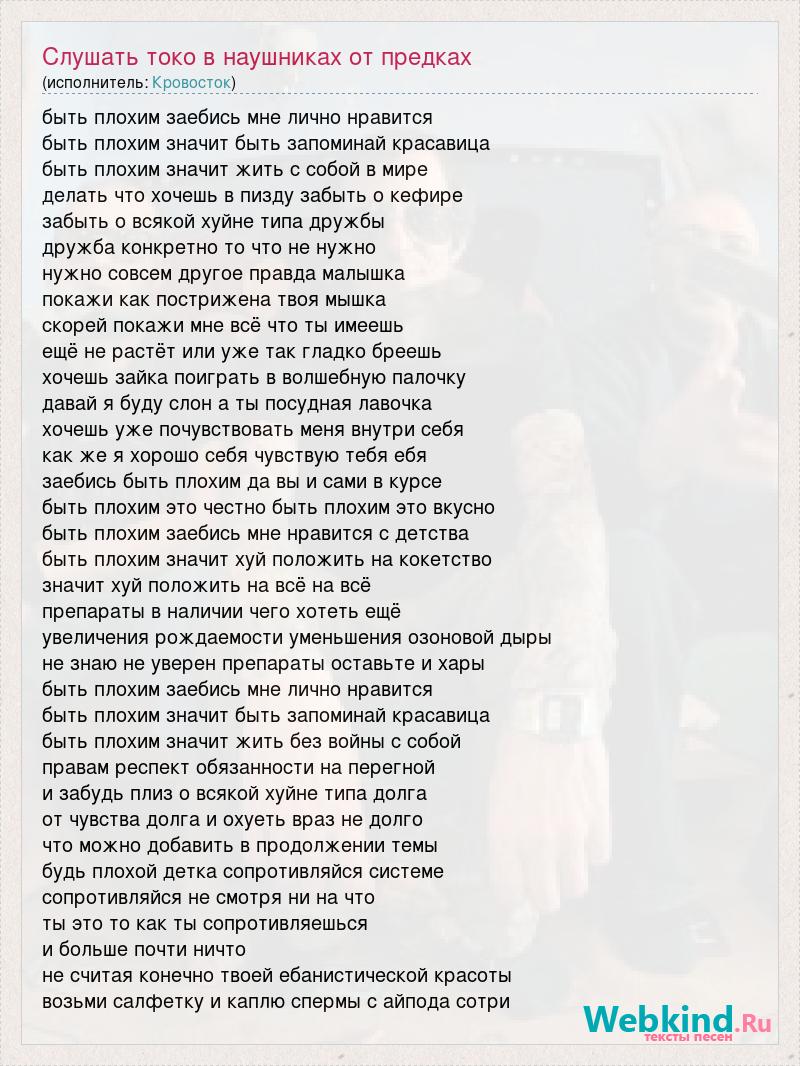 быть плохим заебись мне лично нравится быть плохим значит быть запоминай красавица быть плохим значит жить с собой в мире делать что хочешь в пизду забыть о кефире забыть о всякой хуйне типа дружбы дружба конкретно то что не нужно нужно совсем другое правда малышка покажи как пострижена твоя мышка скорей покажи мне всё что ты имеешь ещё не растёт или уже так гладко бреешь хочешь зайка поиграть в волшебную палочку давай я буду слон а ты посудная лавочка хочешь уже почувствовать меня внутри себя как же я хорошо себя чувствую тебя ебя заебись быть плохим да вы и сами в курсе быть плохим это честно быть плохим это вкусно быть плохим заебись мне нравится с детства быть плохим значит хуй положить на кокетство значит хуй положить на всё на всё препараты в наличии чего хотеть ещё увеличения рождаемости уменьшения озоновой дыры не знаю не уверен препараты оставьте и хары быть плохим заебись мне лично нравится быть плохим значит быть запоминай красавица быть плохим значит жить без войны с собой правам респект обязанности на перегной и забудь плиз о всякой хуйне типа долга от чувства долга и охуеть враз не долго что можно добавить в продолжении темы будь плохой детка сопротивляйся системе сопротивляйся не смотря ни на что ты это то как ты сопротивляешься и больше почти ничто не считая конечно твоей ебанистической красоты возьми салфетку и каплю спермы с айпода сотри