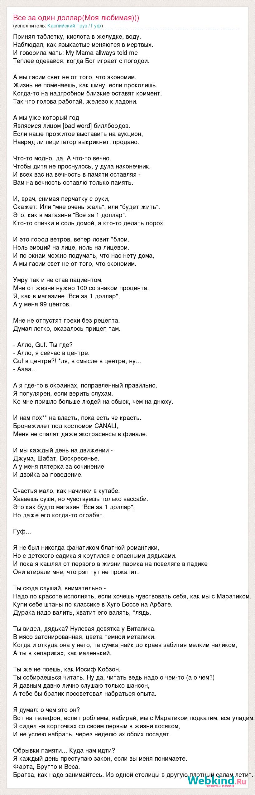 Принял таблетку, кислота в желудке, воду. Наблюдал, как языкастые меняются в мертвых. И говорила мать: My Mama allways told me Теплее одевайся, когда Бог играет с погодой. А мы гасим свет не от того, что экономим. Жизнь не поменяешь, как шину, если проколишь. Когда-то на надгробном близкие оставят коммент. Так что голова работай, железо к ладони. А мы уже который год Являемся лицом [bad word] биллбордов. Если наше прожитое выставить на аукцион, Навряд ли лицитатор выкрикнет: продано. Что-то модно, да. А что-то вечно. Чтобы дитя не проснулось, у дула наконечник. И всех вас на вечность в памяти оставляя - Вам на вечность оставлю только память. И, врач, снимая перчатку с руки, Скажет: Или "мне очень жаль", или "будет жить". Это, как в магазине "Все за 1 доллар". Кто-то спички и соль домой, а кто-то делать порох. И это город ветров, ветер ловит *блом. Ноль эмоций на лице, ноль на лицевом. И по окнам можно подумать, что нас нету дома, А мы гасим свет не от того, что экономим. Умру так и не став пациентом, Мне от жизни нужно 100 со знаком процента. Я, как в магазине "Все за 1 доллар", А у меня 99 центов. Мне не отпустят грехи без рецепта. Думал легко, оказалось прицеп там. - Алло, Guf. Ты где? - Алло, я сейчас в центре. Guf в центре?! *ля, в смысле в центре, ну... - Аааа... А я где-то в окраинах, поправленный правильно. Я популярен, если верить слухам. Ко мне пришло больше людей на обыск, чем на днюху. И нам пох** на власть, пока есть че красть. Бронежилет под костюмом CANALI, Меня не спалят даже экстрасенсы в финале. И мы каждый день на движении - Джума, Шабат, Воскресенье. А у меня пятерка за сочинение И двойка за поведение. Счастья мало, как начинки в кутабе. Хаваешь суши, но чувствуешь только вассаби. Это как будто магазин "Все за 1 доллар", Но даже его когда-то ограбят. Гуф... Я не был никогда фанатиком блатной романтики, Но с детского садика я крутился с опасными дядьками. И пока я кашлял от первого в жизни парика на повеляге в падике Они втирали мне, что рэп тут не прокатит. Ты сюда слушай, внимательно - Надо по красоте исполнять, если хочешь чувствовать себя, как мы с Маратиком. Купи себе штаны по классике в Хуго Боссе на Арбате. Дурака надо валить, хватит его валять, *лядь. Ты видел, дядька? Нулевая девятка у Виталика. В мясо затонированная, цвета темной металики. Когда и откуда она у него, та сумка найк до краев забитая мелким наликом, А ты в кепариках, как маленький. Ты же не поешь, как Иосиф Кобзон. Ты собираешься читать. Ну да, читать ведь надо о чем-то (а о чем?) Я давным давно лично слушаю только шансон, А тебе бы братик посоветовал набраться опыта. Я думал: о чем это он? Вот на телефон, если проблемы, набирай, мы с Маратиком подкатим, все уладим. Я сидел на корточках со своим первым в жизни косяком, И не успею набрать, через неделю их обоих посадят. Обрывки памяти... Куда нам идти? Я каждый день преступаю закон, если вы меня понимаете. Фарта, Брутто и Веса. Братва, как надо занимайтесь. Из одной столицы в другую плотный салам летит.