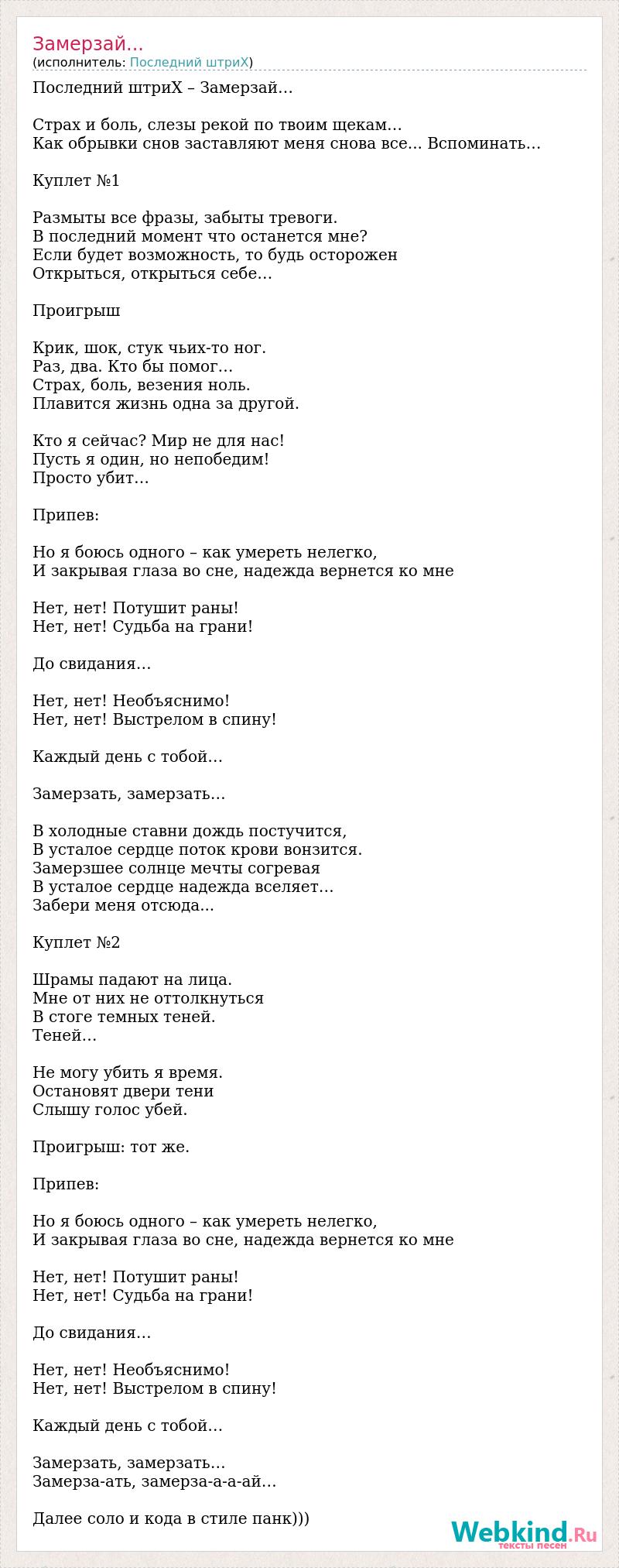Последний штриХ – Замерзай… Страх и боль, слезы рекой по твоим щекам… Как обрывки снов заставляют меня снова все... Вспоминать… Куплет №1 Размыты все фразы, забыты тревоги. В последний момент что останется мне? Если будет возможность, то будь осторожен Открыться, открыться себе… Проигрыш Крик, шок, стук чьих-то ног. Раз, два. Кто бы помог… Страх, боль, везения ноль. Плавится жизнь одна за другой. Кто я сейчас? Мир не для нас! Пусть я один, но непобедим! Просто убит… Припев: Но я боюсь одного – как умереть нелегко, И закрывая глаза во сне, надежда вернется ко мне Нет, нет! Потушит раны! Нет, нет! Судьба на грани! До свидания… Нет, нет! Необъяснимо! Нет, нет! Выстрелом в спину! Каждый день с тобой… Замерзать, замерзать… В холодные ставни дождь постучится, В усталое сердце поток крови вонзится. Замерзшее солнце мечты согревая В усталое сердце надежда вселяет… Забери меня отсюда... Куплет №2 Шрамы падают на лица. Мне от них не оттолкнуться В стоге темных теней. Теней… Не могу убить я время. Остановят двери тени Слышу голос убей. Проигрыш: тот же. Припев: Но я боюсь одного – как умереть нелегко, И закрывая глаза во сне, надежда вернется ко мне Нет, нет! Потушит раны! Нет, нет! Судьба на грани! До свидания… Нет, нет! Необъяснимо! Нет, нет! Выстрелом в спину! Каждый день с тобой… Замерзать, замерзать… Замерза-ать, замерза-а-а-ай… Далее соло и кода в стиле панк)))