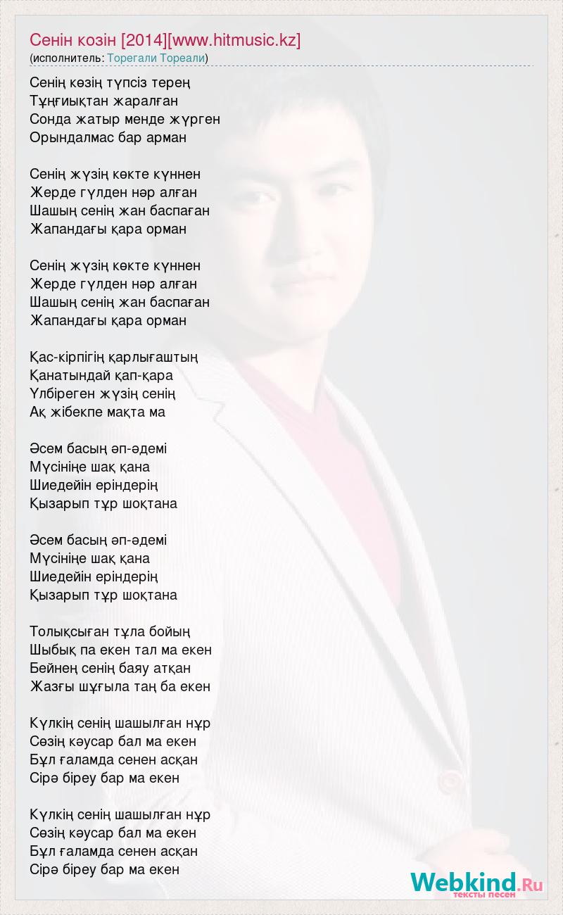 Сенің көзің түпсіз терең Тұңғиықтан жаралған Сонда жатыр менде жүрген Орындалмас бар арман Сенің жүзің көкте күннен Жерде гүлден нәр алған Шашың сенің жан баспаған Жапандағы қара орман Сенің жүзің көкте күннен Жерде гүлден нәр алған Шашың сенің жан баспаған Жапандағы қара орман Қас-кірпігің қарлығаштың Қанатындай қап-қара Үлбіреген жүзің сенің Ақ жібекпе мақта ма Әсем басың әп-әдемі Мүсініңе шақ қана Шиедейін еріндерің Қызарып тұр шоқтана Әсем басың әп-әдемі Мүсініңе шақ қана Шиедейін еріндерің Қызарып тұр шоқтана Толықсыған тұла бойың Шыбық па екен тал ма екен Бейнең сенің баяу атқан Жазғы шұғыла таң ба екен Күлкің сенің шашылған нұр Сөзің кәусар бал ма екен Бұл ғаламда сенен асқан Сірә біреу бар ма екен Күлкің сенің шашылған нұр Сөзің кәусар бал ма екен Бұл ғаламда сенен асқан Сірә біреу бар ма екен