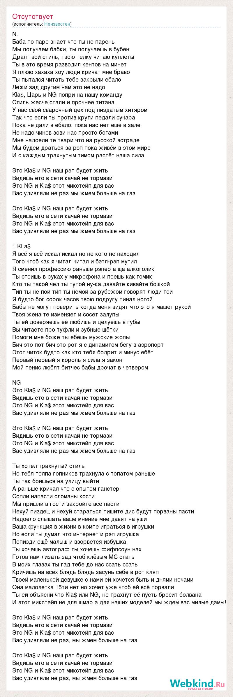 N. Баба по паре знает что ты не парень Мы получаем бабки, ты получаешь в бубен Драл твой стиль, твою телку читаю куплеты Ты в это время разводил кентов на минет Я плюю хахаха хоу люди кричат мне браво Ты пытался читать тебе закрыли ебало Лежи зад другим нам это не надо Kla$, Царь и NG попри на нашу команду Стиль жесче стали и прочнее титана У нас свой сварочный цех под пиздатым хитяром Так что если ты против крути педали сучара Пока не дали в ебало, пока нас нет ещё в зале Не надо чинов зови нас просто богами Мне надоели те твари что на русской эстраде Мы будем драться за рэп пока живём в этом мире И с каждым трахнутым тимом растёт наша сила Это Kla$ и NG наш рэп будет жить Видишь ето в сети качай не тормази Это NG и Kla$ этот микстейп для вас Вас удивляли не раз мы жмем больше на газ Это Kla$ и NG наш рэп будет жить Видишь ето в сети качай не тормази Это NG и Kla$ этот микстейп для вас Вас удивляли не раз мы жмем больше на газ 1 KLa$ Я всё я всё искал искал но не кого не находил Того чтоб как я читал читал и бэтл-рэп мутил Я сменил профессию раньше рэпер а ща алкоголик Ты стоишь в руках у микрофона и поешь как гомик Кто ты такой чел ты тупой ну-ка давайте кивайте бошкой Тип ты не пой тип ты немой за рубежом говорят люди той Я будто бог сорок часов твою подругу пинал ногой Бабы не могут поверить когда меня видят что это я машет рукой Твоя жена те изменяет и сосет залупы Ты ей доверяешь её любишь и целуешь в губы Вы читаете про туфли и зубные щётки Помоги мне боже ты ебёшь мужские жопы Бич это пот бич это рот я с динамитом бегу в аэропорт Этот читок будто как кто тебя бодрит и минус ебёт Первый первый я король я сила я закон Мой пенис любят битчес бабы дрочат в четвером NG Это Kla$ и NG наш рэп будет жить Видишь ето в сети качай не тормази Это NG и Kla$ этот микстейп для вас Вас удивляли не раз мы жмем больше на газ Это Kla$ и NG наш рэп будет жить Видишь ето в сети качай не тормази Это NG и Kla$ этот микстейп для вас Вас удивляли не раз мы жмем больше на газ Ты хотел трахнутый стиль Но тебя толпа гопников трахнула с топатом раньше Ты так боишься на улицу выйти А раньше кричал что с опытом ганстер Сопли напасти сломаны кости Мы пришли в гости закройте все пасти Нехуй пиздец и нехуй стараться пишите дис будут порваны пасти Надоело слышать ваше мнение мне давят на уши Ваша функция в жизни в компе играться в игрушки Но если ты думал что интернет и рэп игрушка Попизди ещё малыш и взорвется избушка Ты хочешь автограф ты хочешь фифпсоун нах Готов нам лизать зад чтоб клёвым MC стать В моих глазах ты гад тебе до нас ссать ссать Кричишь на всех блядь блядь засунь себе в рот кляп Твоей маленькой девушке с нами ей хочется быть и днями ночами Она малолетка 15ти нет но хочет уже чтоб ей всё порвали Ты ей объясни что Kla$ или NG, не трахнут её пусть бросит болвана И этот микстейп не для шмар а для наших моделей мы ждем вас милые дамы! Это Kla$ и NG наш рэп будет жить Видишь ето в сети качай не тормази Это NG и Kla$ этот микстейп для вас Вас удивляли не раз, мы жмем больше на газ Это Kla$ и NG наш рэп будет жить Видишь ето в сети качай не тормази Это NG и Kla$ этот микстейп для вас Вас удивляли не раз, мы жмем больше на газ