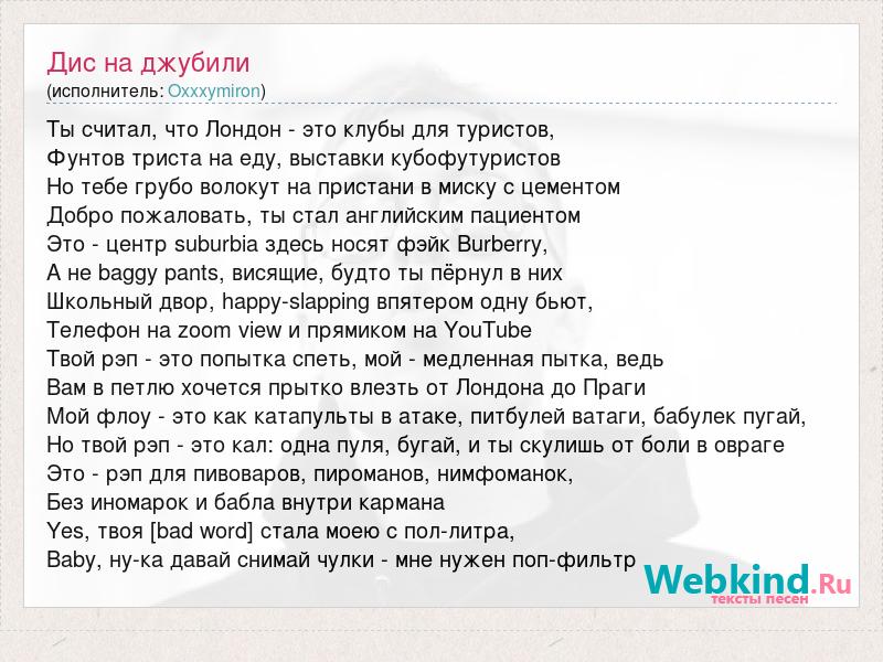 Ты считал, что Лондон - это клубы для туристов, Фунтов триста на еду, выставки кубофутуристов Но тебе грубо волокут на пристани в миску с цементом Добро пожаловать, ты стал английским пациентом Это - центр suburbia здесь носят фэйк Burberry, А не baggy pants, висящие, будто ты пёрнул в них Школьный двор, happy-slapping впятером одну бьют, Телефон на zoom view и прямиком на YouTube Твой рэп - это попытка спеть, мой - медленная пытка, ведь Вам в петлю хочется прытко влезть от Лондона до Праги Мой флоу - это как катапульты в атаке, питбулей ватаги, бабулек пугай, Но твой рэп - это кал: одна пуля, бугай, и ты скулишь от боли в овраге Это - рэп для пивоваров, пироманов, нимфоманок, Без иномарок и бабла внутри кармана Yes, твоя [bad word] стала моею с пол-литра, Baby, ну-ка давай снимай чулки - мне нужен поп-фильтр