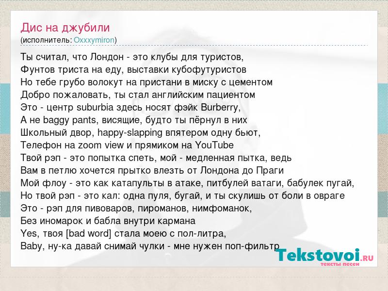 Ты считал, что Лондон - это клубы для туристов, Фунтов триста на еду, выставки кубофутуристов Но тебе грубо волокут на пристани в миску с цементом Добро пожаловать, ты стал английским пациентом Это - центр suburbia здесь носят фэйк Burberry, А не baggy pants, висящие, будто ты пёрнул в них Школьный двор, happy-slapping впятером одну бьют, Телефон на zoom view и прямиком на YouTube Твой рэп - это попытка спеть, мой - медленная пытка, ведь Вам в петлю хочется прытко влезть от Лондона до Праги Мой флоу - это как катапульты в атаке, питбулей ватаги, бабулек пугай, Но твой рэп - это кал: одна пуля, бугай, и ты скулишь от боли в овраге Это - рэп для пивоваров, пироманов, нимфоманок, Без иномарок и бабла внутри кармана Yes, твоя [bad word] стала моею с пол-литра, Baby, ну-ка давай снимай чулки - мне нужен поп-фильтр