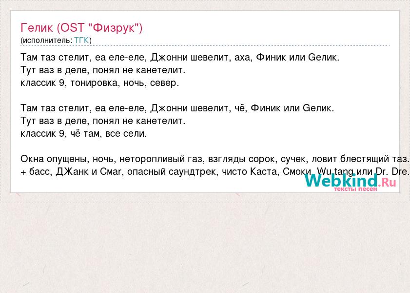 Там таз стелит, еа еле-еле, Джонни шевелит, аха, Финик или Gелик. Тут ваз в деле, понял не канетелит. классик 9, тонировка, ночь, север. Там таз стелит, еа еле-еле, Джонни шевелит, чё, Финик или Gелик. Тут ваз в деле, понял не канетелит. классик 9, чё там, все сели. Окна опущены, ночь, неторопливый газ, взгляды сорок, сучек, ловит блестящий таз. + басс, ДЖанк и Смаr, опасный саундтрек, чисто Каста, Смоки, Wu tang или Dr. Dre.
