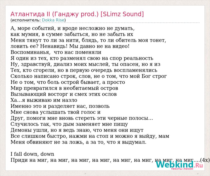 А, море событий, и вроде несложно не думать, как мумия, в сумме забыться, но не забыть их Меня тянут то ли за нити, блядь, то ли обитель моя тонет, ловить ее? Ненавидь! Мы давно не на видео! Воспоминанья, что нас поменяли Я один из тех, кто разменял свою на спор реальность Ну, здравствуй, диализ моих мыслей, ты опасен, но я из Тех, кто сгорели, но в первую очередь воспламенялись Сколько написано строк, слов, не о том, что мой Бог строг Не о том, что боль острой бывает, а просто Мир превратился в необитаемый остров Вызывающий восторг и смех этих ослов Ха…я выживаю им назло Именно это и разделяет нас, позволь Мне снова услышать твой голос и Друг, помоги мне вновь стереть эти черные полосы… Случилось так, что дым заменяет мне пищу Демоны ушли, но я ведь знаю, что меня они ищут Все слишком быстро, нажми на стоп и можно я выйду, мам Меня обвиняют не за ложь, а за то, что я выдумал. I fall down, down Приди на миг, на миг, на миг, на миг, на миг, на миг, на миг, на миг….(4х)
