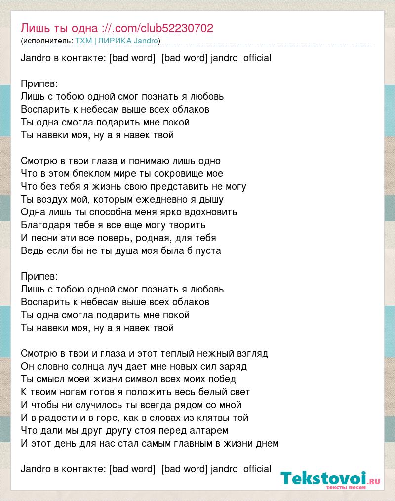 Jandro в контакте: [bad word] [bad word] jandro_official Припев: Лишь с тобою одной смог познать я любовь Воспарить к небесам выше всех облаков Ты одна смогла подарить мне покой Ты навеки моя, ну а я навек твой Смотрю в твои глаза и понимаю лишь одно Что в этом блеклом мире ты сокровище мое Что без тебя я жизнь свою представить не могу Ты воздух мой, которым ежедневно я дышу Одна лишь ты способна меня ярко вдохновить Благодаря тебе я все еще могу творить И песни эти все поверь, родная, для тебя Ведь если бы не ты душа моя была б пуста Припев: Лишь с тобою одной смог познать я любовь Воспарить к небесам выше всех облаков Ты одна смогла подарить мне покой Ты навеки моя, ну а я навек твой Смотрю в твои и глаза и этот теплый нежный взгляд Он словно солнца луч дает мне новых сил заряд Ты смысл моей жизни символ всех моих побед К твоим ногам готов я положить весь белый свет И чтобы ни случилось ты всегда рядом со мной И в радости и в горе, как в словах из клятвы той Что дали мы друг другу стоя перед алтарем И этот день для нас стал самым главным в жизни днем Jandro в контакте: [bad word] [bad word] jandro_official