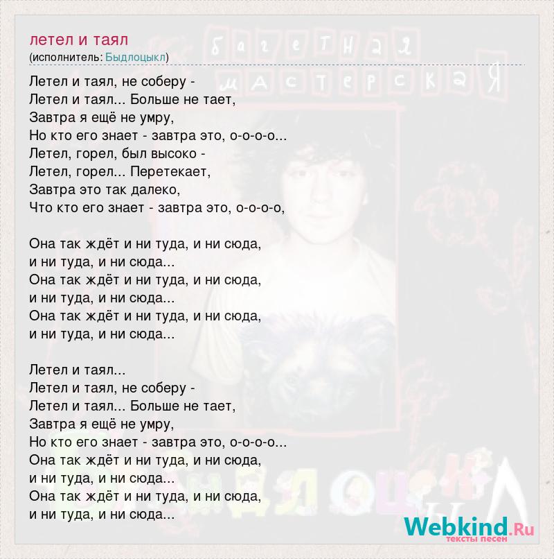 Летел и таял, не соберу - Летел и таял... Больше не тает, Завтра я ещё не умру, Но кто его знает - завтра это, о-о-о-о... Летел, горел, был высоко - Летел, горел... Перетекает, Завтра это так далеко, Что кто его знает - завтра это, о-о-о-о, Она так ждёт и ни туда, и ни сюда, и ни туда, и ни сюда... Она так ждёт и ни туда, и ни сюда, и ни туда, и ни сюда... Она так ждёт и ни туда, и ни сюда, и ни туда, и ни сюда... Летел и таял... Летел и таял, не соберу - Летел и таял... Больше не тает, Завтра я ещё не умру, Но кто его знает - завтра это, о-о-о-о... Она так ждёт и ни туда, и ни сюда, и ни туда, и ни сюда... Она так ждёт и ни туда, и ни сюда, и ни туда, и ни сюда...