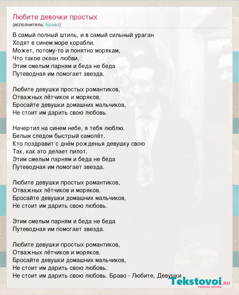 В самый полный штиль, и в самый сильный ураган Ходят в синем море корабли. Может, потому-то и понятно морякам, Что такое океан любви. Этим смелым парням и беда не беда Путеводная им помогает звезда. Любите девушки простых романтиков, Отважных лётчиков и моряков. Бросайте девушки домашних мальчиков, Не стоит им дарить свою любовь. Начертил на синем небе, я тебя люблю. Белым следом быстрый самолёт. Кто поздравит с днём рожденья девушку свою Так, как это делает пилот. Этим смелым парням и беда не беда Путеводная им помогает звезда. Любите девушки простых романтиков, Отважных лётчиков и моряков. Бросайте девушки домашних мальчиков, Не стоит им дарить свою любовь. Этим смелым парням и беда не беда Путеводная им помогает звезда. Любите девушки простых романтиков, Отважных лётчиков и моряков. Бросайте девушки домашних мальчиков, Не стоит им дарить свою любовь. Не стоит им дарить свою любовь. Браво - Любите, Девушки