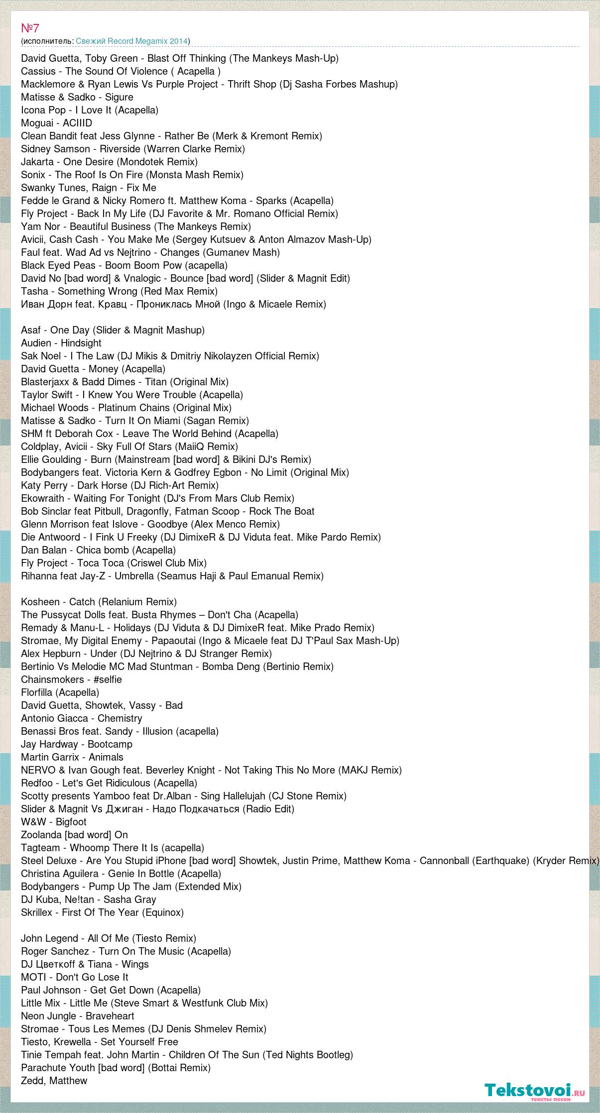 David Guetta, Toby Green - Blast Off Thinking (The Mankeys Mash-Up) Cassius - The Sound Of Violence ( Acapella ) Macklemore & Ryan Lewis Vs Purple Project - Thrift Shop (Dj Sasha Forbes Mashup) Matisse & Sadko - Sigure Icona Pop - I Love It (Acapella) Moguai - ACIIID Clean Bandit feat Jess Glynne - Rather Be (Merk & Kremont Remix) Sidney Samson - Riverside (Warren Clarke Remix) Jakarta - One Desire (Mondotek Remix) Sonix - The Roof Is On Fire (Monsta Mash Remix) Swanky Tunes, Raign - Fix Me Fedde le Grand & Nicky Romero ft. Matthew Koma - Sparks (Acapella) Fly Project - Back In My Life (DJ Favorite & Mr. Romano Official Remix) Yam Nor - Beautiful Business (The Mankeys Remix) Avicii, Cash Cash - You Make Me (Sergey Kutsuev & Anton Almazov Mash-Up) Faul feat. Wad Ad vs Nejtrino - Changes (Gumanev Mash) Black Eyed Peas - Boom Boom Pow (acapella) David No [bad word] & Vnalogic - Bounce [bad word] (Slider & Magnit Edit) Tasha - Something Wrong (Red Max Remix) Иван Дорн feat. Кравц - Прониклась Мной (Ingo & Micaele Remix) Asaf - One Day (Slider & Magnit Mashup) Audien - Hindsight Sak Noel - I The Law (DJ Mikis & Dmitriy Nikolayzen Official Remix) David Guetta - Money (Acapella) Blasterjaxx & Badd Dimes - Titan (Original Mix) Taylor Swift - I Knew You Were Trouble (Acapella) Michael Woods - Platinum Chains (Original Mix) Matisse & Sadko - Turn It On Miami (Sagan Remix) SHM ft Deborah Cox - Leave The World Behind (Acapella) Coldplay, Avicii - Sky Full Of Stars (MaiiQ Remix) Ellie Goulding - Burn (Mainstream [bad word] & Bikini DJ's Remix) Bodybangers feat. Victoria Kern & Godfrey Egbon - No Limit (Original Mix) Katy Perry - Dark Horse (DJ Rich-Art Remix) Ekowraith - Waiting For Tonight (DJ's From Mars Club Remix) Bob Sinclar feat Pitbull, Dragonfly, Fatman Scoop - Rock The Boat Glenn Morrison feat Islove - Goodbye (Alex Menco Remix) Die Antwoord - I Fink U Freeky (DJ DimixeR & DJ Viduta feat. Mike Pardo Remix) Dan Balan - Chica bomb (Acapella) Fly Project - Toca Toca (Criswel Club Mix) Rihanna feat Jay-Z - Umbrella (Seamus Haji & Paul Emanual Remix) Kosheen - Catch (Relanium Remix) The Pussycat Dolls feat. Busta Rhymes – Don't Cha (Acapella) Remady & Manu-L - Holidays (DJ Viduta & DJ DimixeR feat. Mike Prado Remix) Stromae, My Digital Enemy - Papaoutai (Ingo & Micaele feat DJ T'Paul Sax Mash-Up) Alex Hepburn - Under (DJ Nejtrino & DJ Stranger Remix) Bertinio Vs Melodie MC Mad Stuntman - Bomba Deng (Bertinio Remix) Chainsmokers - #selfie Florfilla (Acapella) David Guetta, Showtek, Vassy - Bad Antonio Giacca - Chemistry Benassi Bros feat. Sandy - Illusion (acapella) Jay Hardway - Bootcamp Martin Garrix - Animals NERVO & Ivan Gough feat. Beverley Knight - Not Taking This No More (MAKJ Remix) Redfoo - Let's Get Ridiculous (Acapella) Scotty presents Yamboo feat Dr.Alban - Sing Hallelujah (CJ Stone Remix) Slider & Magnit Vs Джиган - Надо Подкачаться (Radio Edit) W&W - Bigfoot Zoolanda - Come On Tagteam - Whoomp There It Is (acapella) Steel Deluxe - Are You Stupid iPhone [bad word] Showtek, Justin Prime, Matthew Koma - Cannonball (Earthquake) (Kryder Remix) Christina Aguilera - Genie In Bottle (Acapella) Bodybangers - Pump Up The Jam (Extended Mix) DJ Kuba, Ne!tan - Sasha Gray Skrillex - First Of The Year (Equinox) John Legend - All Of Me (Tiesto Remix) Roger Sanchez - Turn On The Music (Acapella) DJ Цветкоff & Tiana - Wings MOTI - Don't Go Lose It Paul Johnson - Get Get Down (Acapella) Little Mix - Little Me (Steve Smart & Westfunk Club Mix) Neon Jungle - Braveheart Stromae - Tous Les Memes (DJ Denis Shmelev Remix) Tiesto, Krewella - Set Yourself Free Tinie Tempah feat. John Martin - Children Of The Sun (Ted Nights Bootleg) Parachute Youth - Runaway (Bottai Remix) Zedd, Matthew