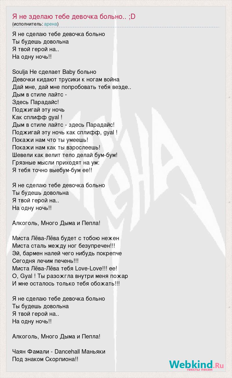 Я не сделаю тебе девочка больно Ты будешь довольна Я твой герой на.. На одну ночь!! Soulja Не сделает Baby больно Девочки кидают трусики к ногам война Дай мне, дай мне попробовать тебя везде.. Дым в стиле лайтс - Здесь Парадайс! Поджигай эту ночь Как сплифф gyal ! Дым в стиле лайтс - здесь Парадайс! Поджигай эту ночь как сплифф, gyal ! Покажи нам что ты умеешь! Покажи нам как ты взрослеешь! Шевели как велит тело делай бум-бум! Грязные мысли приходят на ум: Я тебя точно выебум-бум ее!! Я не сделаю тебе девочка больно Ты будешь довольна Я твой герой на.. На одну ночь!! Алкоголь, Много Дыма и Пепла! Миста Лёва-Лёва будет с тобою нежен Миста сталь между ног безупречен!!! Эй, бармен налей чего нибудь покрепче Сегодня лечим печень!!! Миста Лёва-Лёва тебя Love-Love!!! ее! O, Gyal ! Ты разожгла внутри меня пожар И мне осталось только тебя обожать!!! Я не сделаю тебе девочка больно Ты будешь довольна Я твой герой на.. На одну ночь!! Алкоголь, Много Дыма и Пепла! Чаян Фамали - Dancehall Маньяки Под знаком Скорпиона!!
