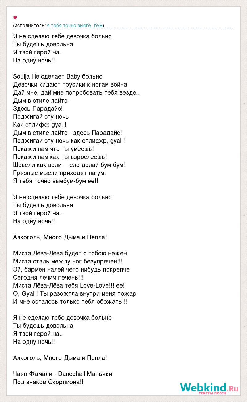 Я не сделаю тебе девочка больно Ты будешь довольна Я твой герой на.. На одну ночь!! Soulja Не сделает Baby больно Девочки кидают трусики к ногам война Дай мне, дай мне попробовать тебя везде.. Дым в стиле лайтс - Здесь Парадайс! Поджигай эту ночь Как сплифф gyal ! Дым в стиле лайтс - здесь Парадайс! Поджигай эту ночь как сплифф, gyal ! Покажи нам что ты умеешь! Покажи нам как ты взрослеешь! Шевели как велит тело делай бум-бум! Грязные мысли приходят на ум: Я тебя точно выебум-бум ее!! Я не сделаю тебе девочка больно Ты будешь довольна Я твой герой на.. На одну ночь!! Алкоголь, Много Дыма и Пепла! Миста Лёва-Лёва будет с тобою нежен Миста сталь между ног безупречен!!! Эй, бармен налей чего нибудь покрепче Сегодня лечим печень!!! Миста Лёва-Лёва тебя Love-Love!!! ее! O, Gyal ! Ты разожгла внутри меня пожар И мне осталось только тебя обожать!!! Я не сделаю тебе девочка больно Ты будешь довольна Я твой герой на.. На одну ночь!! Алкоголь, Много Дыма и Пепла! Чаян Фамали - Dancehall Маньяки Под знаком Скорпиона!!