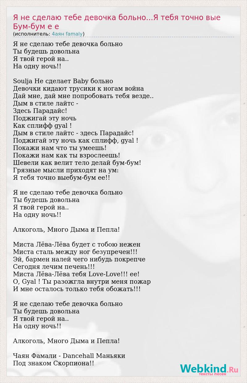 Я не сделаю тебе девочка больно Ты будешь довольна Я твой герой на.. На одну ночь!! Soulja Не сделает Baby больно Девочки кидают трусики к ногам война Дай мне, дай мне попробовать тебя везде.. Дым в стиле лайтс - Здесь Парадайс! Поджигай эту ночь Как сплифф gyal ! Дым в стиле лайтс - здесь Парадайс! Поджигай эту ночь как сплифф, gyal ! Покажи нам что ты умеешь! Покажи нам как ты взрослеешь! Шевели как велит тело делай бум-бум! Грязные мысли приходят на ум: Я тебя точно выебум-бум ее!! Я не сделаю тебе девочка больно Ты будешь довольна Я твой герой на.. На одну ночь!! Алкоголь, Много Дыма и Пепла! Миста Лёва-Лёва будет с тобою нежен Миста сталь между ног безупречен!!! Эй, бармен налей чего нибудь покрепче Сегодня лечим печень!!! Миста Лёва-Лёва тебя Love-Love!!! ее! O, Gyal ! Ты разожгла внутри меня пожар И мне осталось только тебя обожать!!! Я не сделаю тебе девочка больно Ты будешь довольна Я твой герой на.. На одну ночь!! Алкоголь, Много Дыма и Пепла! Чаян Фамали - Dancehall Маньяки Под знаком Скорпиона!!