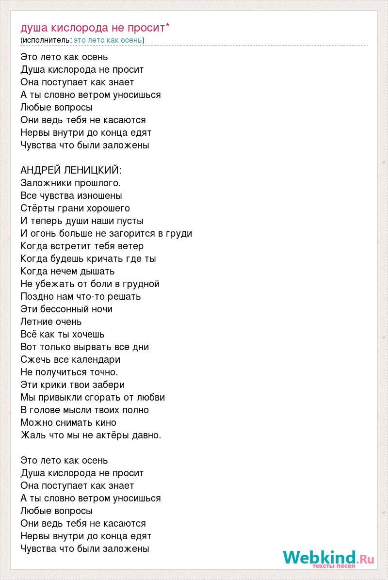 Это лето как осень Душа кислорода не просит Она поступает как знает А ты словно ветром уносишься Любые вопросы Они ведь тебя не касаются Нервы внутри до конца едят Чувства что были заложены АНДРЕЙ ЛЕНИЦКИЙ: Заложники прошлого. Все чувства изношены Стёрты грани хорошего И теперь души наши пусты И огонь больше не загорится в груди Когда встретит тебя ветер Когда будешь кричать где ты Когда нечем дышать Не убежать от боли в грудной Поздно нам что-то решать Эти бессонный ночи Летние очень Всё как ты хочешь Вот только вырвать все дни Сжечь все календари Не получиться точно. Эти крики твои забери Мы привыкли сгорать от любви В голове мысли твоих полно Можно снимать кино Жаль что мы не актёры давно. Это лето как осень Душа кислорода не просит Она поступает как знает А ты словно ветром уносишься Любые вопросы Они ведь тебя не касаются Нервы внутри до конца едят Чувства что были заложены