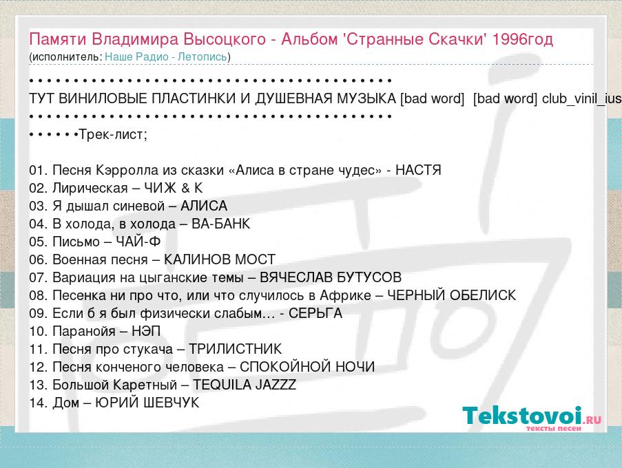 • • • • • • • • • • • • • • • • • • • • • • • • • • • • • • • • • • • • • • • • • ТУТ ВИНИЛОВЫЕ ПЛАСТИНКИ И ДУШЕВНАЯ МУЗЫКА [bad word] [bad word] club_vinil_ius • • • • • • • • • • • • • • • • • • • • • • • • • • • • • • • • • • • • • • • • • • • • • • •Трек-лист; 01. Песня Кэрролла из сказки «Алиса в стране чудес» - НАСТЯ 02. Лирическая – ЧИЖ & К 03. Я дышал синевой – АЛИСА 04. В холода, в холода – ВА-БАНК 05. Письмо – ЧАЙ-Ф 06. Военная песня – КАЛИНОВ МОСТ 07. Вариация на цыганские темы – ВЯЧЕСЛАВ БУТУСОВ 08. Песенка ни про что, или что случилось в Африке – ЧЕРНЫЙ ОБЕЛИСК 09. Если б я был физически слабым… - СЕРЬГА 10. Паранойя – НЭП 11. Песня про стукача – ТРИЛИСТНИК 12. Песня конченого человека – СПОКОЙНОЙ НОЧИ 13. Большой Каретный – TEQUILA JAZZZ 14. Дом – ЮРИЙ ШЕВЧУК