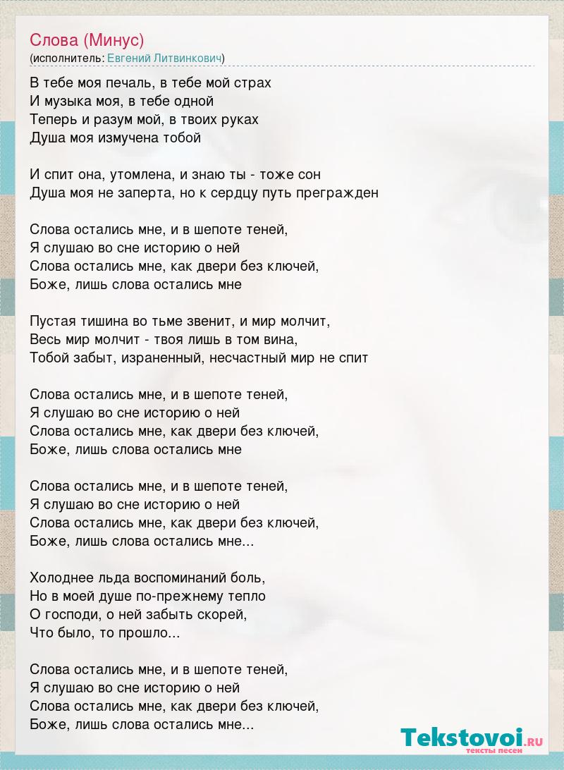 В тебе моя печаль, в тебе мой страх И музыка моя, в тебе одной Теперь и разум мой, в твоих руках Душа моя измучена тобой И спит она, утомлена, и знаю ты - тоже сон Душа моя не заперта, но к сердцу путь прегражден Слова остались мне, и в шепоте теней, Я слушаю во сне историю о ней Слова остались мне, как двери без ключей, Боже, лишь слова остались мне Пустая тишина во тьме звенит, и мир молчит, Весь мир молчит - твоя лишь в том вина, Тобой забыт, израненный, несчастный мир не спит Слова остались мне, и в шепоте теней, Я слушаю во сне историю о ней Слова остались мне, как двери без ключей, Боже, лишь слова остались мне Слова остались мне, и в шепоте теней, Я слушаю во сне историю о ней Слова остались мне, как двери без ключей, Боже, лишь слова остались мне... Холоднее льда воспоминаний боль, Но в моей душе по-прежнему тепло О господи, о ней забыть скорей, Что было, то прошло... Слова остались мне, и в шепоте теней, Я слушаю во сне историю о ней Слова остались мне, как двери без ключей, Боже, лишь слова остались мне...