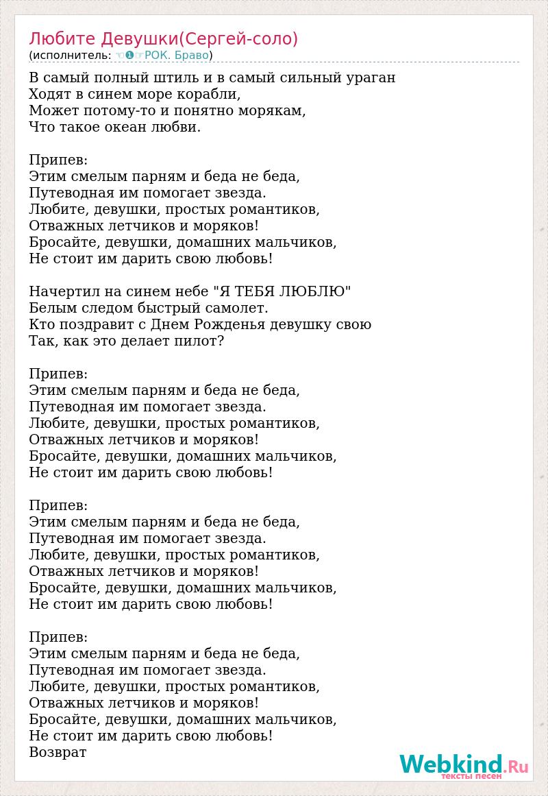 В самый полный штиль и в самый сильный ураган Ходят в синем море корабли, Может потому-то и понятно морякам, Что такое океан любви. Припев: Этим смелым парням и беда не беда, Путеводная им помогает звезда. Любите, девушки, простых романтиков, Отважных летчиков и моряков! Бросайте, девушки, домашних мальчиков, Не стоит им дарить свою любовь! Начертил на синем небе "Я ТЕБЯ ЛЮБЛЮ" Белым следом быстрый самолет. Кто поздравит с Днем Рожденья девушку свою Так, как это делает пилот? Припев: Этим смелым парням и беда не беда, Путеводная им помогает звезда. Любите, девушки, простых романтиков, Отважных летчиков и моряков! Бросайте, девушки, домашних мальчиков, Не стоит им дарить свою любовь! Припев: Этим смелым парням и беда не беда, Путеводная им помогает звезда. Любите, девушки, простых романтиков, Отважных летчиков и моряков! Бросайте, девушки, домашних мальчиков, Не стоит им дарить свою любовь! Припев: Этим смелым парням и беда не беда, Путеводная им помогает звезда. Любите, девушки, простых романтиков, Отважных летчиков и моряков! Бросайте, девушки, домашних мальчиков, Не стоит им дарить свою любовь! Возврат
