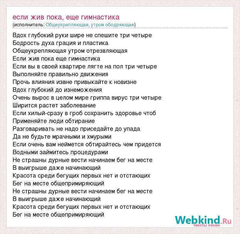 Вдох глубокий руки шире не спешите три четыре Бодрость духа грация и пластика Общеукрепляющая утром отрезвляющая Если жив пока еще гимнастика Если вы в своей квартире лягте на пол три четыре Выполняйте правильно движения Прочь влияния извне привыкайте к новизне Вдох глубокий до изнеможения Очень вырос в целом мире гриппа вирус три четыре Ширится растет заболевание Если хилый-сразу в гроб сохранить здоровье чтоб Применяйте люди обтирание Разговаривать не надо приседайте до упада Да не будьте мрачными и хмурыми Если очень вам неймется обтирайтесь чем придется Водными займитесь процедурами Не страшны дурные вести начинаем бег на месте В выигрыше даже начинающий Красота среди бегущих первых нет и отстающих Бег на месте общепримиряющий Не страшны дурные вести начинаем бег на месте В выигрыше даже начинающий Красота среди бегущих первых нет и отстающих Бег на месте общепримиряющий