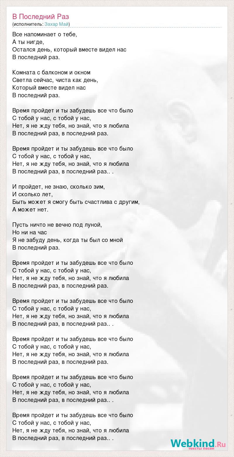Все напоминает о тебе, А ты нигде, Остался день, который вместе видел нас В последний раз. Комната с балконом и окном Светла сейчас, чиста как день, Который вместе видел нас В последний раз. Время пройдет и ты забудешь все что было С тобой у нас, с тобой у нас, Нет, я не жду тебя, но знай, что я любила В последний раз, в последний раз. Время пройдет и ты забудешь все что было С тобой у нас, с тобой у нас, Нет, я не жду тебя, но знай, что я любила В последний раз, в последний раз.. . И пройдет, не знаю, сколько зим, И сколько лет, Быть может я смогу быть счастлива с другим, А может нет. Пусть ничто не вечно под луной, Но ни на час Я не забуду день, когда ты был со мной В последний раз. Время пройдет и ты забудешь все что было С тобой у нас, с тобой у нас, Нет, я не жду тебя, но знай, что я любила В последний раз, в последний раз. Время пройдет и ты забудешь все что было С тобой у нас, с тобой у нас, Нет, я не жду тебя, но знай, что я любила В последний раз, в последний раз.. . Время пройдет и ты забудешь все что было С тобой у нас, с тобой у нас, Нет, я не жду тебя, но знай, что я любила В последний раз, в последний раз. Время пройдет и ты забудешь все что было С тобой у нас, с тобой у нас, Нет, я не жду тебя, но знай, что я любила В последний раз, в последний раз.. . Время пройдет и ты забудешь все что было С тобой у нас, с тобой у нас, Нет, я не жду тебя, но знай, что я любила В последний раз, в последний раз.. .
