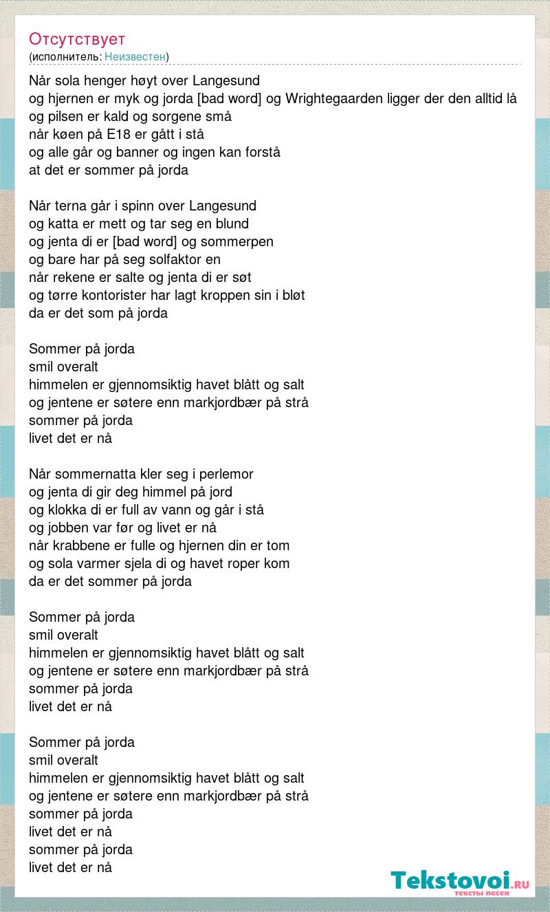 Når sola henger høyt over Langesund og hjernen er myk og jorda er rund og Wrightegaarden ligger der den alltid lå og pilsen er kald og sorgene små når køen på E18 er gått i stå og alle går og banner og ingen kan forstå at det er sommer på jorda Når terna går i spinn over Langesund og katta er mett og tar seg en blund og jenta di er gyllenbrun og sommerpen og bare har på seg solfaktor en når rekene er salte og jenta di er søt og tørre kontorister har lagt kroppen sin i bløt da er det som på jorda Sommer på jorda smil overalt himmelen er gjennomsiktig havet blått og salt og jentene er søtere enn markjordbær på strå sommer på jorda livet det er nå Når sommernatta kler seg i perlemor og jenta di gir deg himmel på jord og klokka di er full av vann og går i stå og jobben var før og livet er nå når krabbene er fulle og hjernen din er tom og sola varmer sjela di og havet roper kom da er det sommer på jorda Sommer på jorda smil overalt himmelen er gjennomsiktig havet blått og salt og jentene er søtere enn markjordbær på strå sommer på jorda livet det er nå Sommer på jorda smil overalt himmelen er gjennomsiktig havet blått og salt og jentene er søtere enn markjordbær på strå sommer på jorda livet det er nå sommer på jorda livet det er nå
