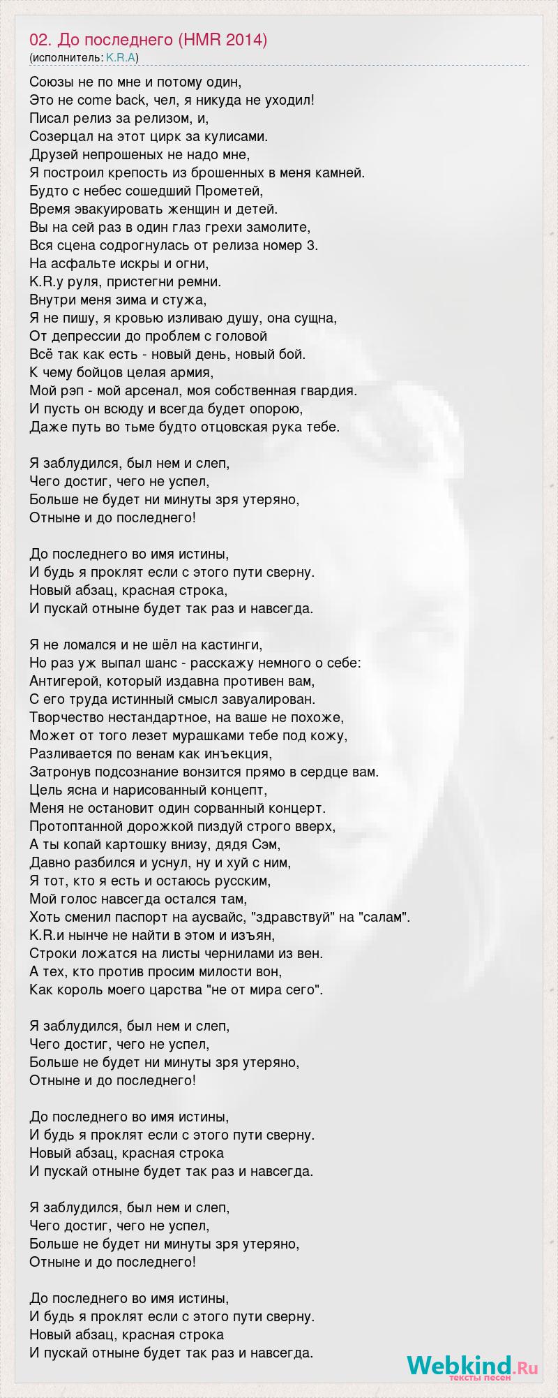 Союзы не по мне и потому один, Это не come back, чел, я никуда не уходил! Писал релиз за релизом, и, Созерцал на этот цирк за кулисами. Друзей непрошеных не надо мне, Я построил крепость из брошенных в меня камней. Будто с небес сошедший Прометей, Время эвакуировать женщин и детей. Вы на сей раз в один глаз грехи замолите, Вся сцена содрогнулась от релиза номер 3. На асфальте искры и огни, K.R.у руля, пристегни ремни. Внутри меня зима и стужа, Я не пишу, я кровью изливаю душу, она сущна, От депрессии до проблем с головой Всё так как есть - новый день, новый бой. К чему бойцов целая армия, Мой рэп - мой арсенал, моя собственная гвардия. И пусть он всюду и всегда будет опорою, Даже путь во тьме будто отцовская рука тебе. Я заблудился, был нем и слеп, Чего достиг, чего не успел, Больше не будет ни минуты зря утеряно, Отныне и до последнего! До последнего во имя истины, И будь я проклят если с этого пути сверну. Новый абзац, красная строка, И пускай отныне будет так раз и навсегда. Я не ломался и не шёл на кастинги, Но раз уж выпал шанс - расскажу немного о себе: Антигерой, который издавна противен вам, С его труда истинный смысл завуалирован. Творчество нестандартное, на ваше не похоже, Может от того лезет мурашками тебе под кожу, Разливается по венам как инъекция, Затронув подсознание вонзится прямо в сердце вам. Цель ясна и нарисованный концепт, Меня не остановит один сорванный концерт. Протоптанной дорожкой пиздуй строго вверх, А ты копай картошку внизу, дядя Сэм, Давно разбился и уснул, ну и хуй с ним, Я тот, кто я есть и остаюсь русским, Мой голос навсегда остался там, Хоть сменил паспорт на аусвайс, "здравствуй" на "салам". K.R.и нынче не найти в этом и изъян, Строки ложатся на листы чернилами из вен. А тех, кто против просим милости вон, Как король моего царства "не от мира сего". Я заблудился, был нем и слеп, Чего достиг, чего не успел, Больше не будет ни минуты зря утеряно, Отныне и до последнего! До последнего во имя истины, И будь я проклят если с этого пути сверну. Новый абзац, красная строка И пускай отныне будет так раз и навсегда. Я заблудился, был нем и слеп, Чего достиг, чего не успел, Больше не будет ни минуты зря утеряно, Отныне и до последнего! До последнего во имя истины, И будь я проклят если с этого пути сверну. Новый абзац, красная строка И пускай отныне будет так раз и навсегда.