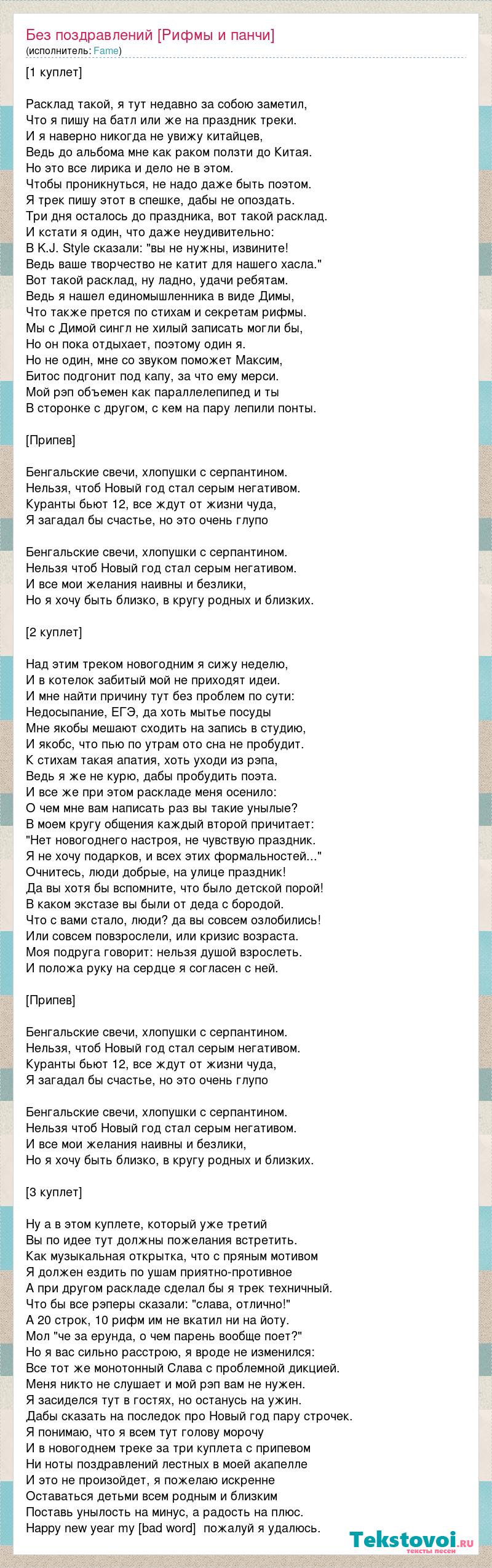[1 куплет] Расклад такой, я тут недавно за собою заметил, Что я пишу на батл или же на праздник треки. И я наверно никогда не увижу китайцев, Ведь до альбома мне как раком ползти до Китая. Но это все лирика и дело не в этом. Чтобы проникнуться, не надо даже быть поэтом. Я трек пишу этот в спешке, дабы не опоздать. Три дня осталось до праздника, вот такой расклад. И кстати я один, что даже неудивительно: В K.J. Style сказали: "вы не нужны, извините! Ведь ваше творчество не катит для нашего хасла." Вот такой расклад, ну ладно, удачи ребятам. Ведь я нашел единомышленника в виде Димы, Что также прется по стихам и секретам рифмы. Мы с Димой сингл не хилый записать могли бы, Но он пока отдыхает, поэтому один я. Но не один, мне со звуком поможет Максим, Битос подгонит под капу, за что ему мерси. Мой рэп объемен как параллелепипед и ты В сторонке с другом, с кем на пару лепили понты. [Припев] Бенгальские свечи, хлопушки с серпантином. Нельзя, чтоб Новый год стал серым негативом. Куранты бьют 12, все ждут от жизни чуда, Я загадал бы счастье, но это очень глупо Бенгальские свечи, хлопушки с серпантином. Нельзя чтоб Новый год стал серым негативом. И все мои желания наивны и безлики, Но я хочу быть близко, в кругу родных и близких. [2 куплет] Над этим треком новогодним я сижу неделю, И в котелок забитый мой не приходят идеи. И мне найти причину тут без проблем по сути: Недосыпание, ЕГЭ, да хоть мытье посуды Мне якобы мешают сходить на запись в студию, И якобс, что пью по утрам ото сна не пробудит. К стихам такая апатия, хоть уходи из рэпа, Ведь я же не курю, дабы пробудить поэта. И все же при этом раскладе меня осенило: О чем мне вам написать раз вы такие унылые? В моем кругу общения каждый второй причитает: "Нет новогоднего настроя, не чувствую праздник. Я не хочу подарков, и всех этих формальностей..." Очнитесь, люди добрые, на улице праздник! Да вы хотя бы вспомните, что было детской порой! В каком экстазе вы были от деда с бородой. Что с вами стало, люди? да вы совсем озлобились! Или совсем повзрослели, или кризис возраста. Моя подруга говорит: нельзя душой взрослеть. И положа руку на сердце я согласен с ней. [Припев] Бенгальские свечи, хлопушки с серпантином. Нельзя, чтоб Новый год стал серым негативом. Куранты бьют 12, все ждут от жизни чуда, Я загадал бы счастье, но это очень глупо Бенгальские свечи, хлопушки с серпантином. Нельзя чтоб Новый год стал серым негативом. И все мои желания наивны и безлики, Но я хочу быть близко, в кругу родных и близких. [3 куплет] Ну а в этом куплете, который уже третий Вы по идее тут должны пожелания встретить. Как музыкальная открытка, что с пряным мотивом Я должен ездить по ушам приятно-противное А при другом раскладе сделал бы я трек техничный. Что бы все рэперы сказали: "слава, отлично!" А 20 строк, 10 рифм им не вкатил ни на йоту. Мол "че за ерунда, о чем парень вообще поет?" Но я вас сильно расстрою, я вроде не изменился: Все тот же монотонный Слава с проблемной дикцией. Меня никто не слушает и мой рэп вам не нужен. Я засиделся тут в гостях, но останусь на ужин. Дабы сказать на последок про Новый год пару строчек. Я понимаю, что я всем тут голову морочу И в новогоднем треке за три куплета с припевом Ни ноты поздравлений лестных в моей акапелле И это не произойдет, я пожелаю искренне Оставаться детьми всем родным и близким Поставь унылость на минус, а радость на плюс. Happy new year my [bad wo