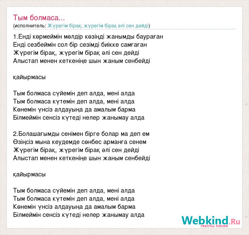 1.Енді көрмеймін мөлдір көзіңді жанымды баураған Енді сезбеймін сол бір сезімді биікке самғаған Жүрегім бірақ, жүрегім бірақ әлі сен дейді Алыстап менен кеткеніңе шын жаным сенбейді қайырмасы Тым болмаса сүйемін деп алда, мені алда Тым болмаса күтемін деп алда, мені алда Көнемін үнсіз алдауыңа да амалым барма Білмеймін сенсіз күтеді нелер жанымау алда 2.Болашағымды сенімен бірге болар ма деп ем Өзіңсіз мына кеудемде сөнбес арманға сенем Жүрегім бірақ, жүрегім бірақ әлі сен дейді Алыстап менен кеткеніңе шын жаным сенбейді қайырмасы Тым болмаса сүйемін деп алда, мені алда Тым болмаса күтемін деп алда, мені алда Көнемін үнсіз алдауыңа да амалым барма Білмеймін сенсіз күтеді нелер жанымау алда